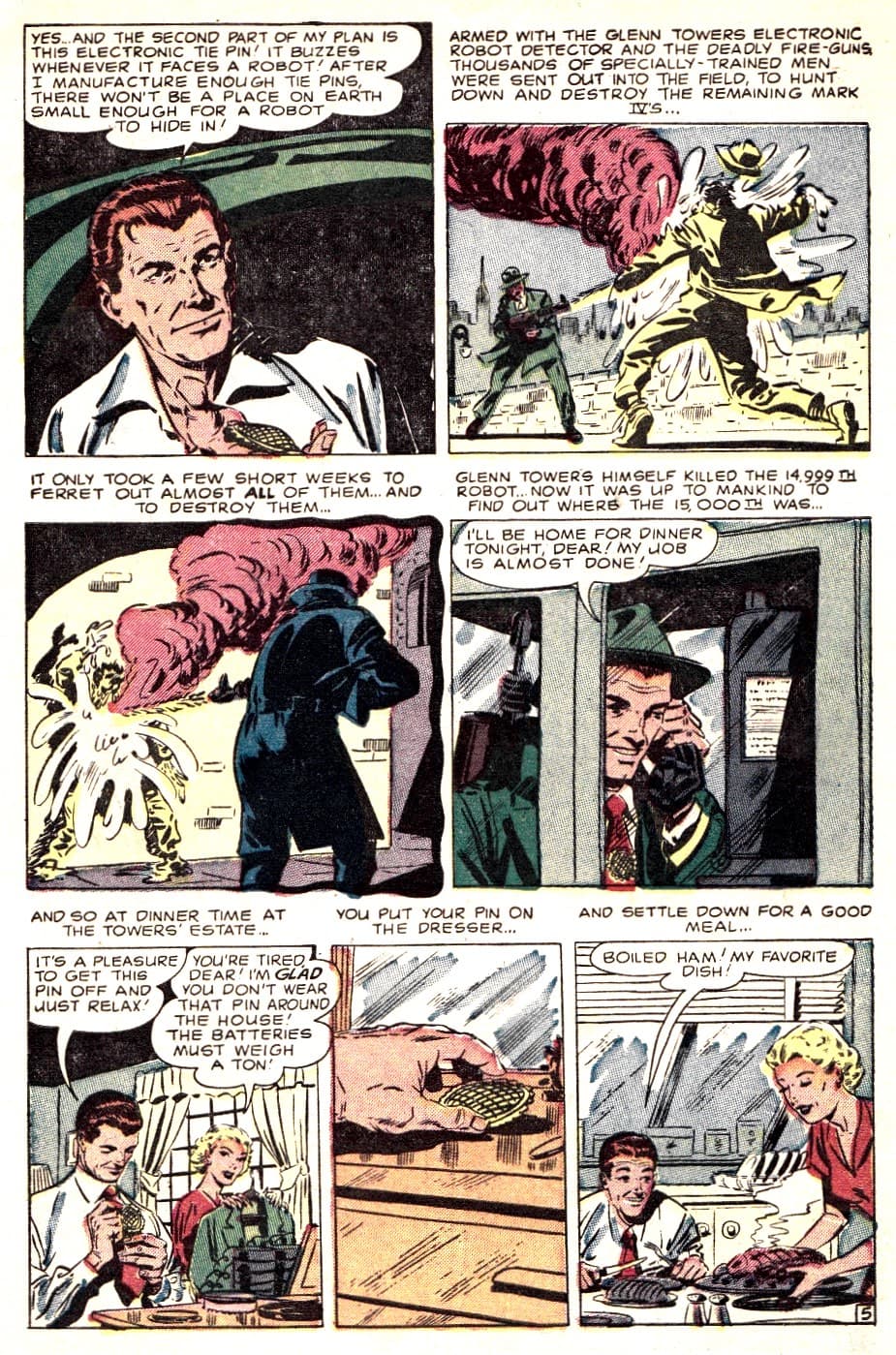 C’est à ce moment du récit, quand toute cette évolution est bien expliquée, que nous retrouvons Glenn Towers, artisan de la répression des robots parce qu’il a inventé un thermo-fusil capable de les détruire et un détecteur susceptible de les repérer. Enquêteur et inventeur, voilà encore une occurrence du génie polyvalent, du scientifique polymathe, tel qu’on en voit des flopées dans l’univers Marvel.