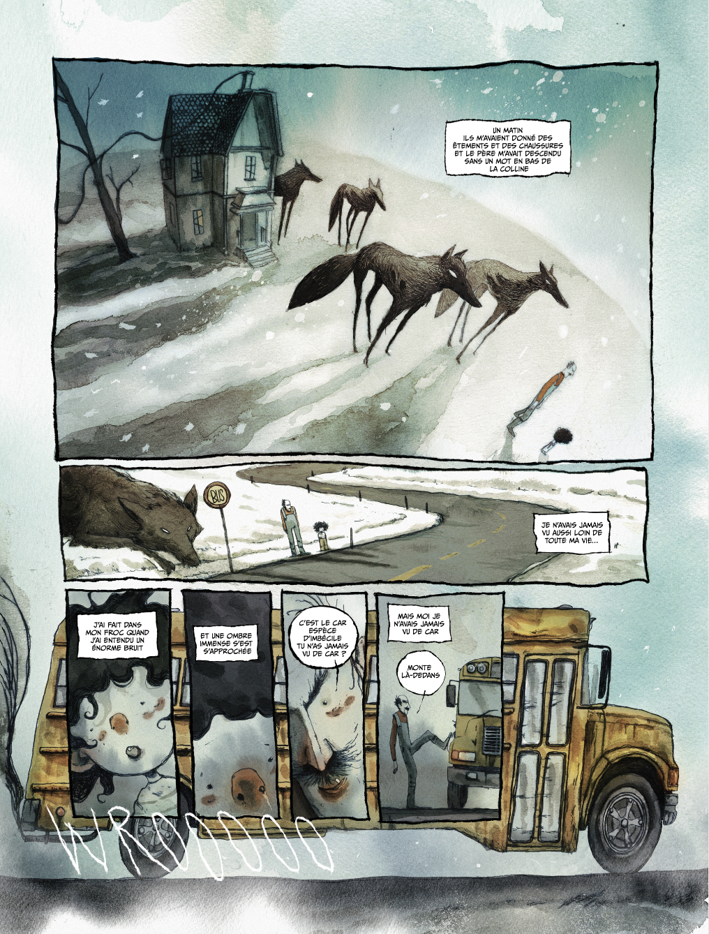 Le scénario écrit, je l’envoie à Vincenzo qui se l’accapare et le sublime avec sa vision du roman et de notre découpage. Ajoutant sa patte magnifique à cette histoire dure mais si poétique !Attention, c’est de la poésie en images !