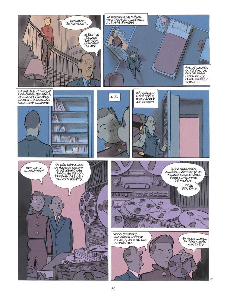 Pacific Palace, un hôtel paisible au bord d’un lac qui l’est tout autant. Spirou regrette déjà d’y avoir fait engager à ses côtés Fantasio, viré comme un malpropre du Moustique. Car l’ex-journaliste reconverti en groom n’a vraiment pas la vocation et ne rate pas une occasion de fâcher M. Paul, leur supérieur hiérarchique. Mais trop tard pour faire machine arrière : un véritable huis clos est décrété et l’hôtel se retrouve sans clientèle et avec un personnel réduit pour accueillir discrètement Iliex Korda, dictateur déchu du Karajan, petit pays des Balkans. Dans ses bagages, d’imposants gardes du corps mais aussi Elena, fille du « Grand Guide » au regard envoûtant, dont Spirou tombe instantanément amoureux. Alors que Fantasio ne rate pas une occasion de provoquer l’entourage du tyran, Spirou essaie de comprendre l’étrange ballet politicien qui se joue presque sous ses yeux.