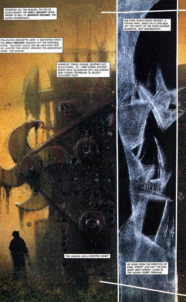 Evoquons (sans l’évacuer) tout de suite la question : dans sa volonté de s’atteler à l’évocation d’une célèbre série de meurtres irrésolus, et par les influences qui l’émaillent (notamment celle de l’auteur Iain Sinclair, sur laquelle nous reviendrons…), « Bible John » fait énormément penser au chef-d’œuvre d’Alan Moore et Eddie Campbell, « From Hell », même si on ne peut comparer la « notoriété » du tueur de Glasgow avec celle de Jack l’Eventreur, la figure au centre du projet de Moore. Et si le premier des 10 numéros de « From Hell » est paru après « Bible John » à la fin de l’année 1991, quelques-uns des premiers chapitres ont été publiés dès 1989 dans l’anthologie « Taboo », dirigée par Steve Bissette. En tant que projet, « From Hell » est antérieur à « Bible John », sans l’ombre d’un doute. Mais finalement, malgré ces similitudes évidentes, et une thématique globale commune (nous y reviendrons), les deux œuvres diffèrent aussi grandement, principalement du point de vue formel.