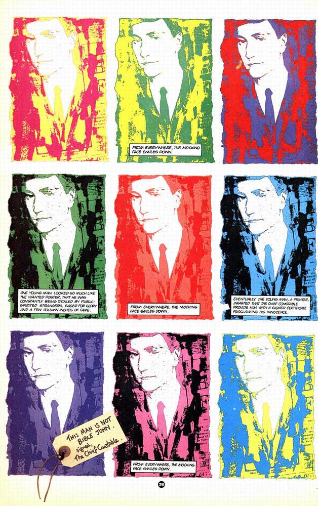 D’autre part, l’écossais continue à explorer les étranges et étroites relations que le réel entretient avec la fiction ; ici, il se dédouble (et Vallely aussi), mêlant jusqu’à l’indistinction auteur et personnages (d’une manière différente qu’avec King Mob des « Invisibles », mais c’est tout de même du même ordre) et considère également Bible John, à partir du moment où sa trace est perdue, comme une figure double : il y a le « vrai » meurtrier, dont l’identité importe peu à partir du moment où elle ne peut être établie avec certitude, et il y a Bible John, une fiction, une silhouette fantomatique, moins en rapport avec le réel mais plus « importante ». C’est le Bible John du fameux portrait-robot, ce dernier ayant probablement fait plus de mal que de bien à l’enquête, d’ailleurs.
