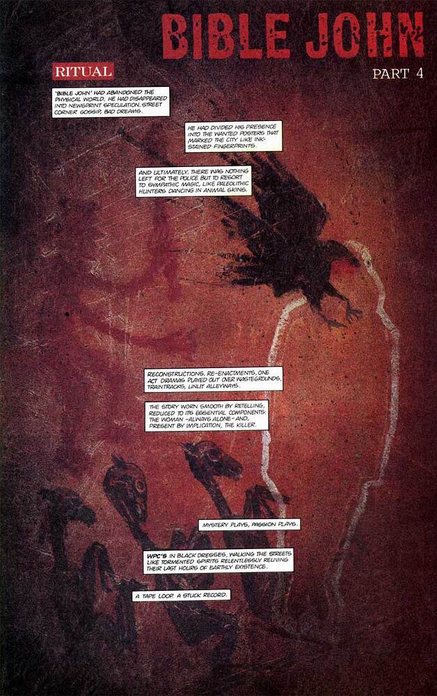 « Bible John » n’obéit pas à ce type de schéma, et sa narration bouscule plus violemment les codes du medium. Il n’y a pour ainsi dire pas de personnages dans « Bible John » : certes, les victimes et quelques autres acteurs de cette série de crimes y figurent, mais comme des « silhouettes », au sens où l’on qualifie les silhouettes au cinéma (presque des figurants, donc). Les principaux personnages de l’histoire sont en fait des êtres invisibles ou presque : il s’agit de Grant Morrison, Daniel Vallely, et le tueur lui-même. Ce dernier n’apparaît pourtant pas en personne, et pour cause : contrairement à Moore qui choisit d’adhérer (pour les besoins de son scénario) à la théorie de Stephen Knight sur l’identité de Jack l’Eventreur, Morrison et Vallely n’ont aucune théorie sur l’identité du coupable, et précisent d’emblée qu’ils se lancent sur une piste « refroidie » (sans mauvais jeu de mots) depuis longtemps. Ils savent que leur « enquête » se conclura par une impasse. Mais tel n’est pas leur propos.