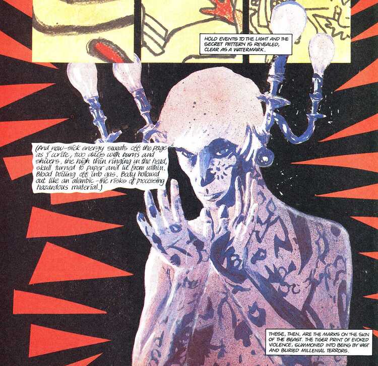 Morrison n’est pas franchement à son aise dans l’exercice de la prose, comme en attestent les quelques problèmes stylistiques de son fameux (et excellent) épisode de Batman « The Clown at Midnight » et l’abandon de son projet de roman « The If ». Pourtant, alors qu’il a ici l’espace de s’épancher un peu plus que dans le cadre d’un comic-book classique, il excelle, variant ses effets et obtenant une belle dynamique entre aphorismes courts et menaçants et descriptions plus ampoulées et souvent jouissives dans le registre « dark fantasy », pour situer. Un exemple des quelques petits coups de génie qui émaillent sa narration : une case représente le panneau indicateur d’une banale rue de Glasgow, mais dans la caption, au détour d’une référence, Morrison place le nom de Dunwich, qui résonnera aux oreilles des lecteurs de Lovecraft. Il faut préciser que la rue en question fut le théâtre de l’un des meurtres : quand le texte confère une dimension supplémentaire au dessin… Morrison n’est jamais meilleur que lorsqu’il joue sur les interactions entre les images et les mots (ce qui explique sûrement en partie ses difficultés à passer à la prose).