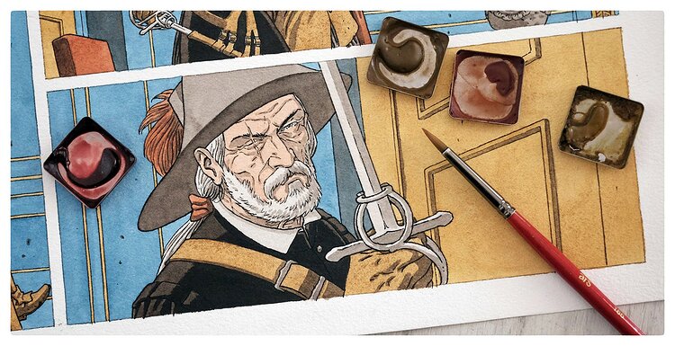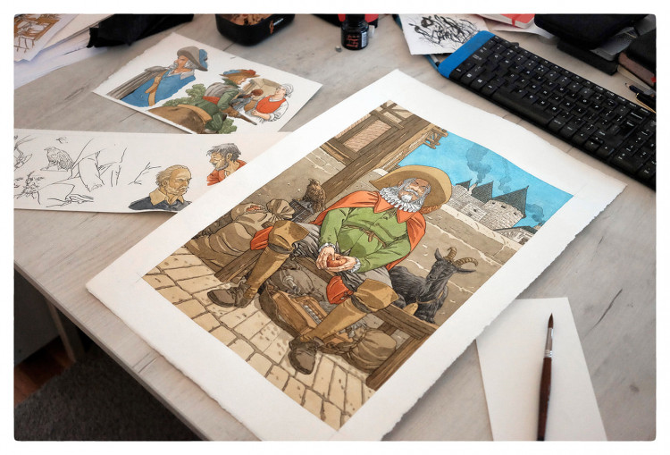 André Juillard naît à Paris, le 9 juin 1948. Très rapidement, la passion du dessin est au rendez-vous. Enfant, il dévore l’hebdomadaire ‹ Tintin ›. La lecture des Hergé, Jacobs, Martin et Bob De Moor de la haute époque font de lui un spécialiste, encore inconscient, de la ligne claire. Le manuel d’histoire de la classe de sixième sera sa seconde grande influence, spécialement les pages consacrées à l’Antiquité. Il ne le sait pas encore, mais sa passion pour la ligne claire, l’Histoire et les histoires feront de lui un auteur moderne n’oubliant jamais de tirer les leçons du passé. Après avoir passé son bac en 1967, il s’inscrit aux Arts Décoratifs de Paris, où il rencontre Martin Veyron et Jean-Claude Denis. En 1974, il fait ses débuts dans ‹ Formule 1 ›, avec un western scénarisé par Claude Verrien. Ce dernier lui écrit « Les Aventures chevaleresques de Bohémond de Saint-Gilles ». Les amateurs éclairés devinent déjà un grand espoir de la bande dessinée réaliste. En 1978, il dessine « Les Cathares » dans ‹ Djinn › avant d’entamer une collaboration fructueuse avec Patrick Cothias en publiant « Masquerouge » dans ‹ Pif Gadget ›. En 1982, avec le même scénariste, il publie les premières pages des « Sept Vies de l’Épervier » qui le font entrer directement dans la section « classiques de la BD contemporaine ». Comme Jacques Martin le fit en son temps avec « Alix », Juillard crée un nouveau pan de BD historique réaliste. Une véritable école s’en inspire, quelques talents, beaucoup d’ersatz. Lui, humble, continue son chemin. Comme tous les grands dessinateurs, il se sent des ailes pour, de temps à autre, écrire le récit qu’il mettra ensuite en images. D’autant que, parfois, il éprouve le besoin d’échapper à l’Histoire, sa maîtresse favorite. Pour « (À SUIVRE) », il publie l’intimiste Cahier bleu qui lui vaudra, en janvier 1995, le Prix du meilleur album au Festival d’Angoulême. L’année suivante, il recevra le Grand Prix du même festival. Le premier cycle des « Sept vies de l’Épervier » s’est achevé après sept albums aux éditions Glénat. La belle Arianne de Troil manque autant à ses créateurs qu’au public. Nécessité fait loi : elle reviendra au sein de la série « Plume-aux-vents » chez Dargaud. Si le premier cycle se déroule en France, la suite (4 volumes) met en scène une Amérique qui aurait pu être française. En 2014, « Quinze ans après », nouvel album des aventures de « l’Épervier », débute un troisième et nouveau cycle de la série. En 2021, sort le deuxième titre de ce cycle, le dernier que Juillard dessine avant de passer la main à Milan Jovanovic. L’ombre de « Blake et Mortimer » se rapproche progressivement de Juillard. À la fin des années quatre-vingt, les éditions Blake et Mortimer le contactent pour réaliser le second tome des « Trois Formules du professeur Sato ». Mais il ne se sent pas encore prêt à relever un tel défi. Cependant, en 1998, il crée chez Dargaud, avec son vieux complice Didier Convard, la collection « Le dernier chapitre », contant la dernière aventure des plus célèbres héros de l’âge d’or de la bande dessinée. Un opus sera bien évidemment réservé à Philip Mortimer et Francis Blake. L’heure de vérité vient quand, en 2000, il dessine, sur un scénario d’Yves Sente, « La Machination Voronov ». En 2003, la même équipe publie le premier tome du diptyque « Les Sarcophages du 6e continent », suivi un an plus tard du tome deux. Juillard poursuit sa lancée en réalisant dans la même collection « Le sanctuaire du Gondwana ». En 2016 sortira un nouvel opus des Aventures de Blake et Mortimer, toujours avec la complicité de Yves Sente : « Le Testament de William S ». En dehors de sa participation à la série Blake et Mortimer, il travaille avec de nombreux grands scénaristes comme Pierre Christin (« Léna » dont un troisième tome sort en 2020), ou encore Yann (« Mezek » et « Double 7 »). En tant qu’illustrateur, il se distingue notamment aux éditions Beaulet et également chez Daniel Maghen, qui publie une autobiographie par images, Entracte. Ses talents sont célébrés lors du festival BDFIL de Lausanne en 2008, où il est l’invité d’honneur. Une exposition « Destins-Dessins » est d’ailleurs consacrée à son oeuvre.