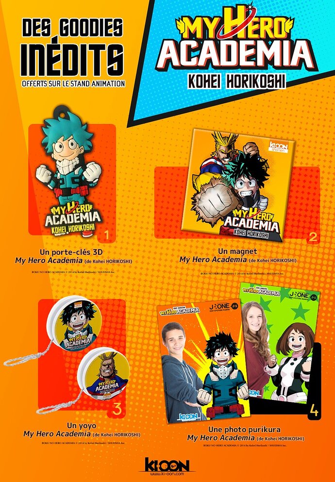 Des cadeaux à gagner grâce à un super stand My Hero Academia, dans lequel on pourra tenter plusieurs jeux. A gagner : des portes clés, des yoyos et des magnets. Et en plus vous pourrez faire des purikura avec les héros de My Hero Academia