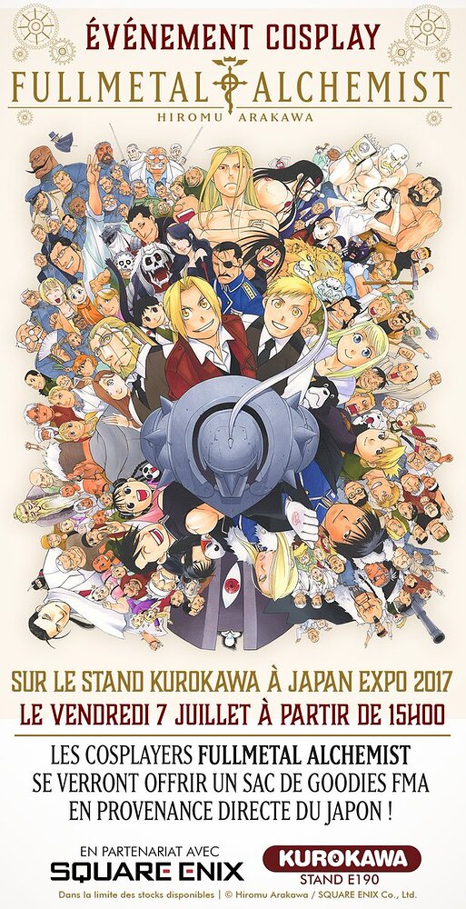 Les cosplayers de Fullmetal Alchemist devront se rendre sur le stand Kurokawa le vendredi à partir de 15h pour repartir avec un sac de goodies FMA