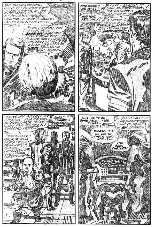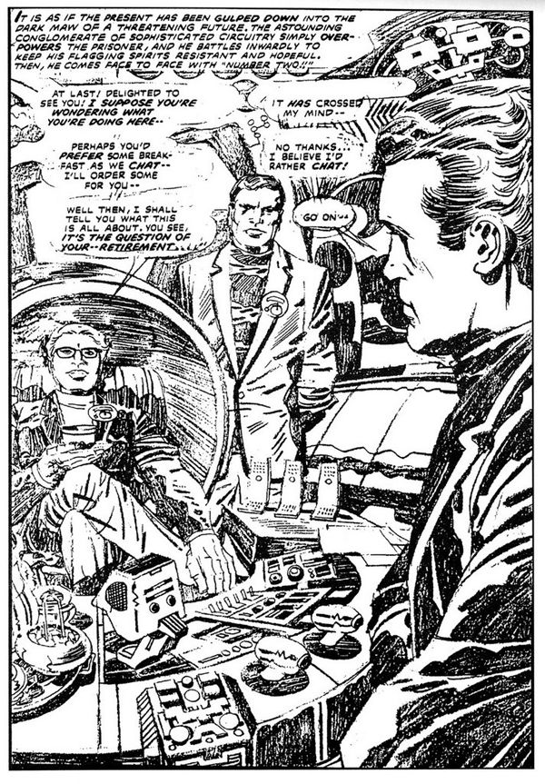 Et Gil Kane avait réalisé plusieurs pages (magnifiques, j’aime beaucoup Gil Kane pour ma part) pour The Prisoner, on peut les voir ici avec des pages du script d’Englehart.