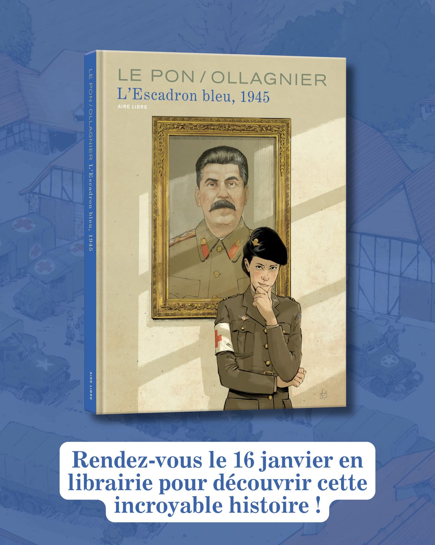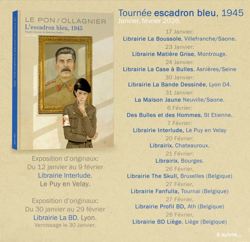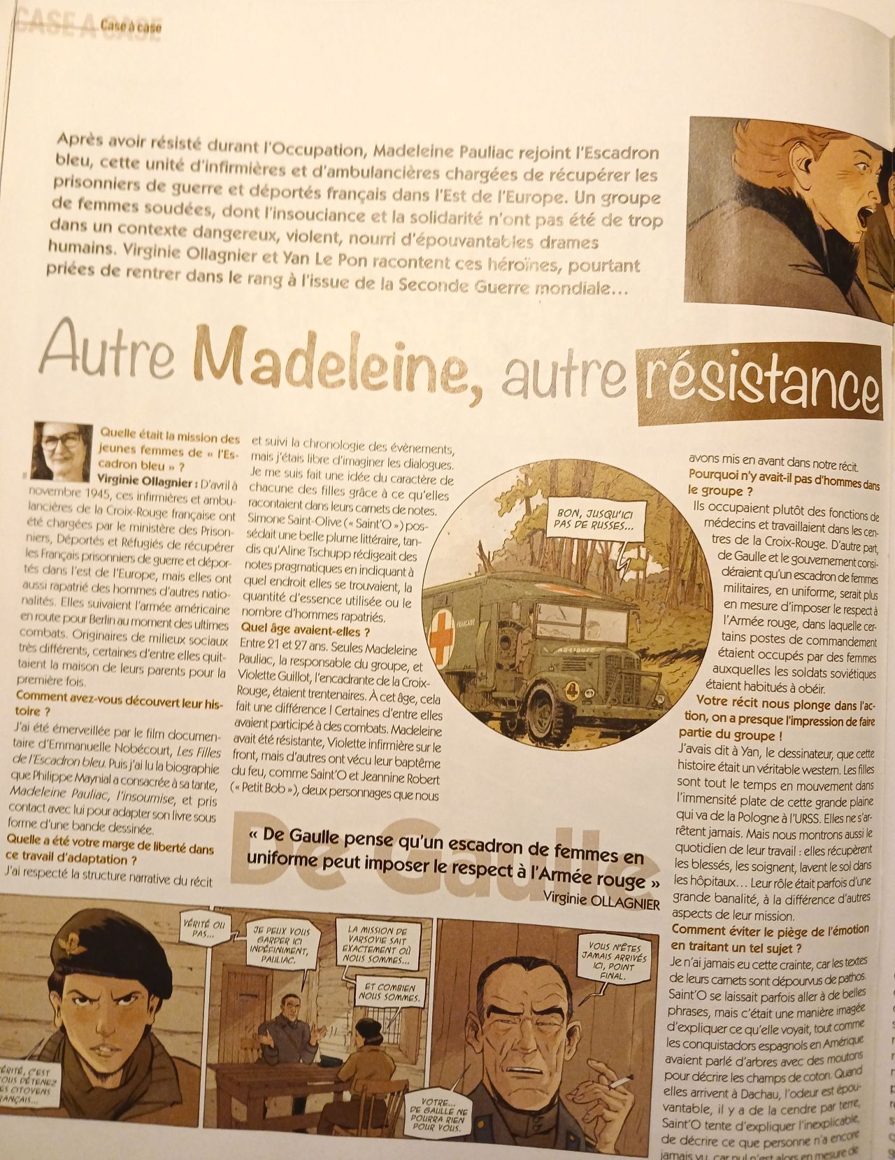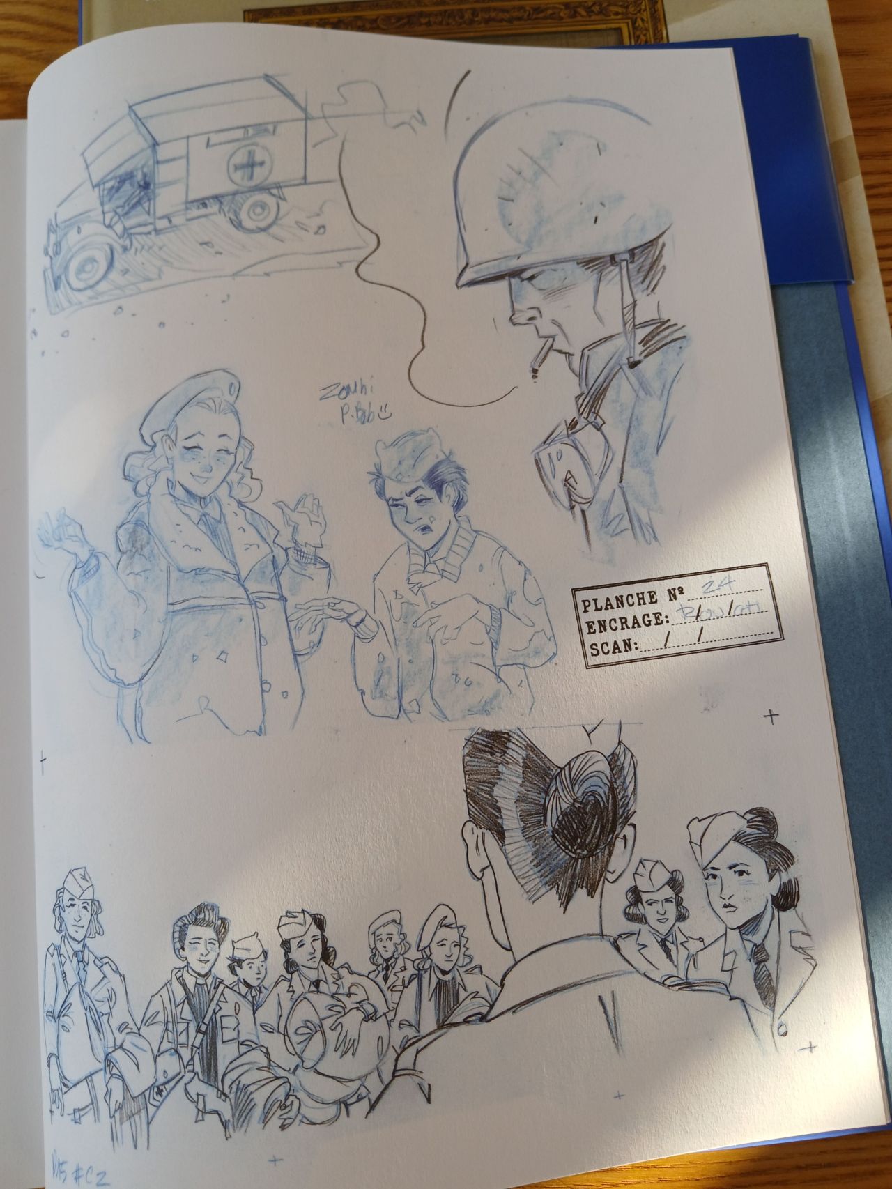 Cette semaine, ultimes vérifications sur le livre, Sortie prévue le 16 janvier. Presque 3 ans de travail sur un livre de 152 pages. Qui retrace le parcours de femmes exceptionnelles. Elles étaient conductrices, infirmière en 1945, elles ont sauvé des vies en parcourant toute l’Europe dans leurs ambulances. Une épopée à travers l’Allemagne et la Pologne jusqu’en URSS. L’Escadron Bleu, 1945, un scénario de Virginie Ollagnier, adapté du livre de Philippe Maynial : « Madeleine Pauliac, L’insoumise ».