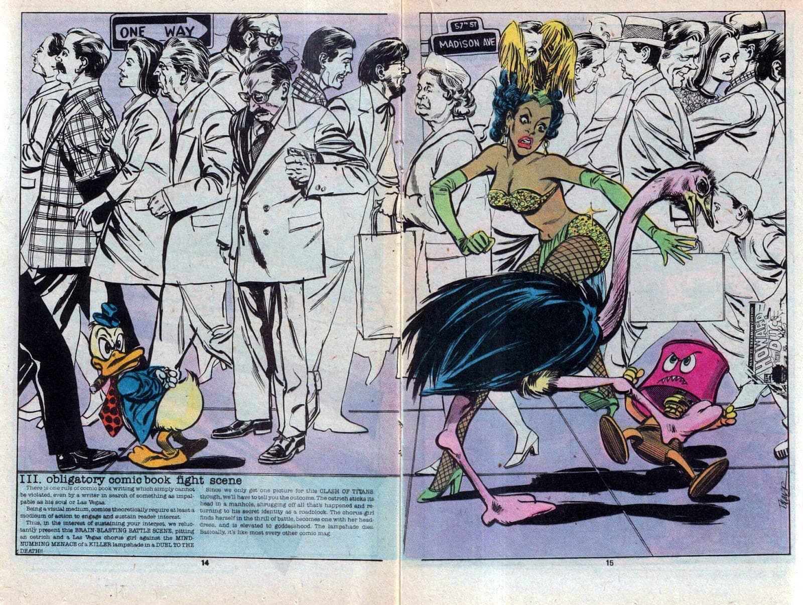 Ou comment une simple parodie de Superman (peut-être plus transgressive qu’il n’y paraît au premier abord, tout de même) déclenche l’ire de DC Comics (cela s’est matérialisé par un coup de fil furibard de Carmine Infantino à Stan Lee) et manque provoquer le licenciement de Gerber, qui rattrape le coup comme il peut à chaque apparition ultérieure du perso, en l’éloignant chaque fois un peu plus de son modèle de la distinguée concurrence.