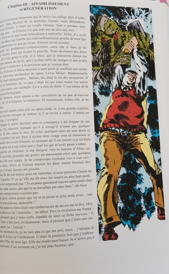 Enfin, notre monstre interviendra pour tenter de sauver (involontairement, il ne pense pas mais est empathe) une jeune fille. Cette dernière va publier le journal de son ami, mort dans des circonstances suspectes mais que personne n’ose remettre en question. La question de la différence et de l’intolérance, de la haine ordinaire revient. Gerber publie même des pages de proses (le journal), ce qu’il fit et fera encore sur certains épisodes (permettant de supporter les deadlines qu’il ne respectait jamais). Un épisode assez bouleversant devant la calvaire que vécu cet ado avant une mort abjecte.