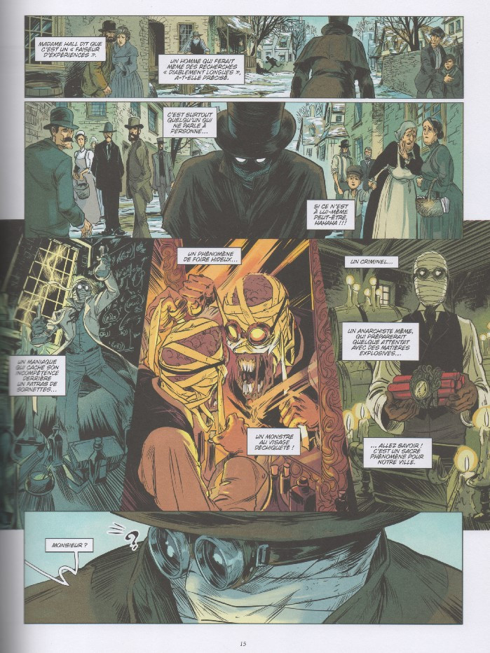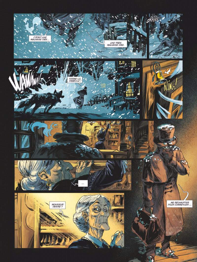 Les dialogues (dont il faudra que je vérifie s’ils restent fidèles à la traduction du roman où s’ils s’en éloignent) mettent en évidence un style un peu suranné mais qui correspond bien à l’ambiance et à l’époque. Toutes ces qualités ne doivent cependant pas faire oublier que l’album est truffé de coquilles (orthographiques, typographiques…) qui témoignent d’un manque de relecture évident.