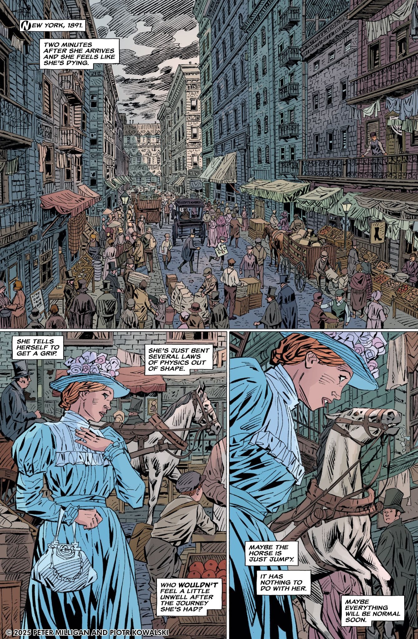 Written by Peter Milligan (Enigma, X-Statix, Britannia) with art by Piotr Kowalski (Where Monsters Lie, Bloodborne), the series follows Aubrey Street, a time traveling fixer sent to erase a proto feminist classic from 1891 before it can alter history. But the deeper she gets, the more she questions the orders—and the people—she serves.