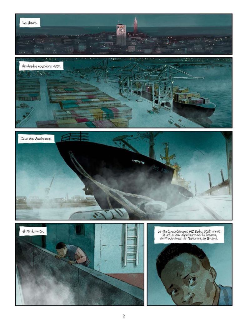 Éditions Dupuis / 2026"C’est une histoire d’hommes à la mer et d’âmes à la dérive. Seul l’océan en détient le terrible secret. Il doit reposer par 2 000 mètres de fond, au large du Portugal, avec les corps de huit pauvres bougres, des passagers clandestins massacrés comme les chatons d’une portée mal venue. Un à un, par une nuit sans étoiles, sept Ghanéens et un Camerounais ont été exécutés et offerts à l’Atlantique, complice déchaîné d’une déferlante de haine. De cette tuerie à bord du MC-Ruby, nul n’aurait jamais dû entendre parler. Le vent, témoin peu scrupuleux, aurait dû emporter les remords des marins et balayer les embruns de la honte.
