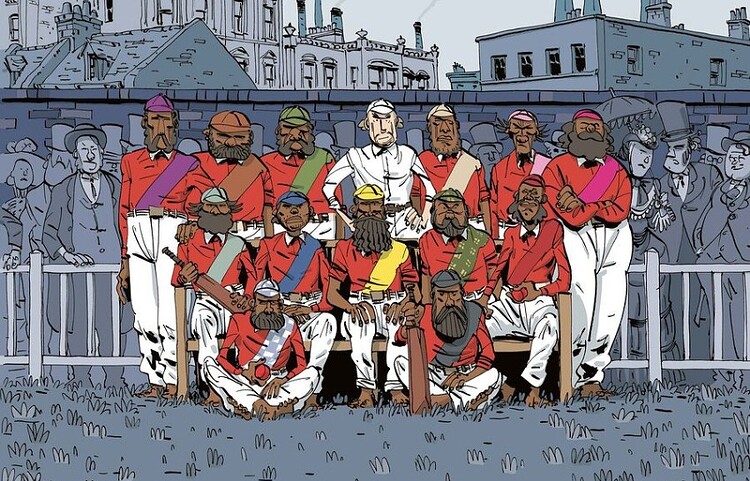 En 1868, la première équipe australienne à partir en tournée mondiale était composée exclusivement de jours aborigènes : ils s’appelaient Dick-a-Dick, Mosquito, King Cole, Twopenny. La BD « Loin des eucalyptus » de @lfbollee et @paulgrosillustration retrace l’épopée aussi brillante que tragique de ces pionniers oubliés du sport.
