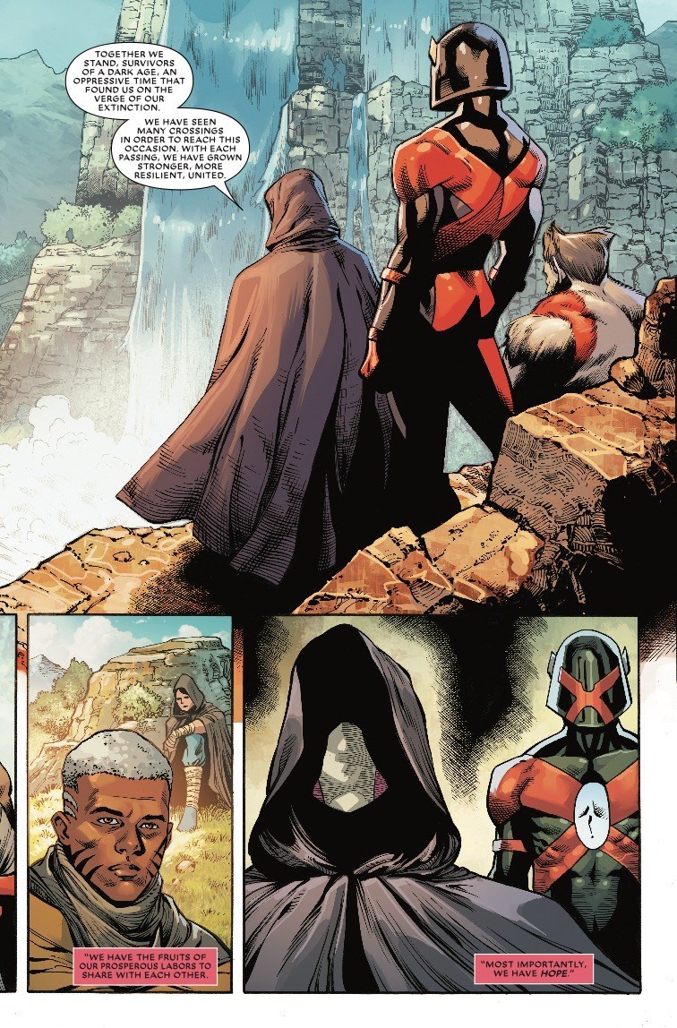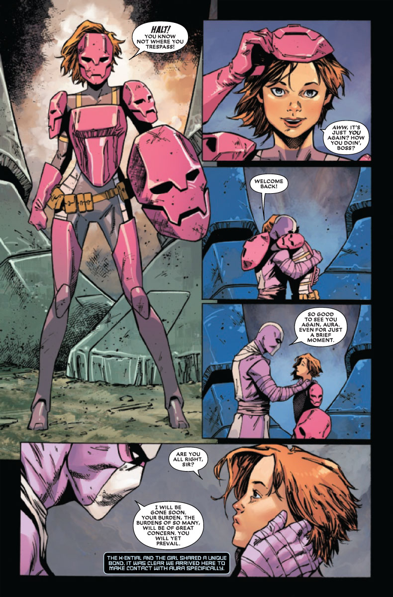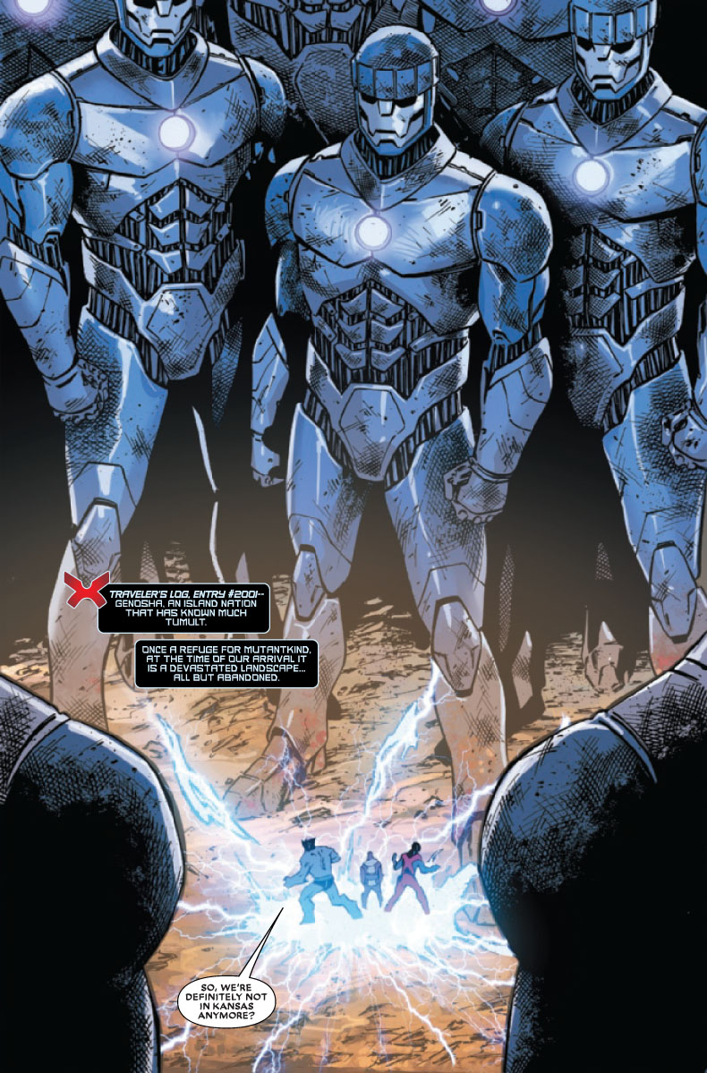 C’est merveilleux. C’est merveilleusement nul, en fait. Incompréhensible, raconté avec les pieds, dessiné comme il peut par Brent Peeples, qui ne peut hélas pas grand-chose, avec un scénario qui improvise à chaque case, et un Rob Liefeld qui se souvient que, tiens, ça serait bien de dater le machin. Nous sommes donc en 2019, avec les X-Men de… ben de la période X-Men Red, alors que nous sommes au-delà ; et que le #1 montrait des designs de Cable, X-Force et Wolverine des années 80. Merveilleux.