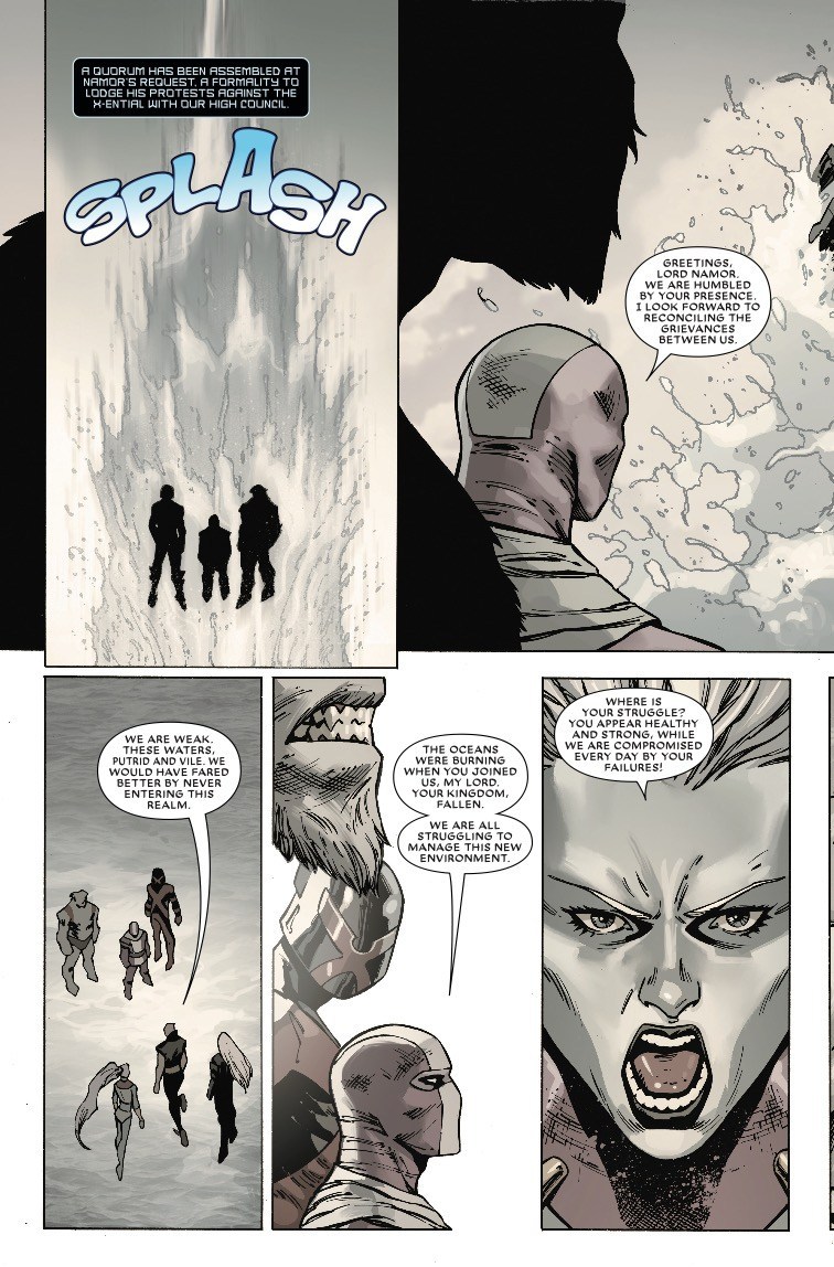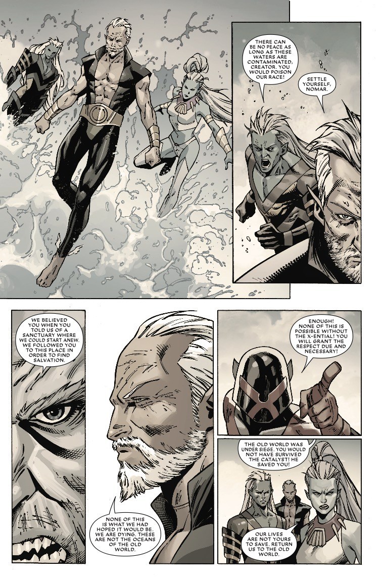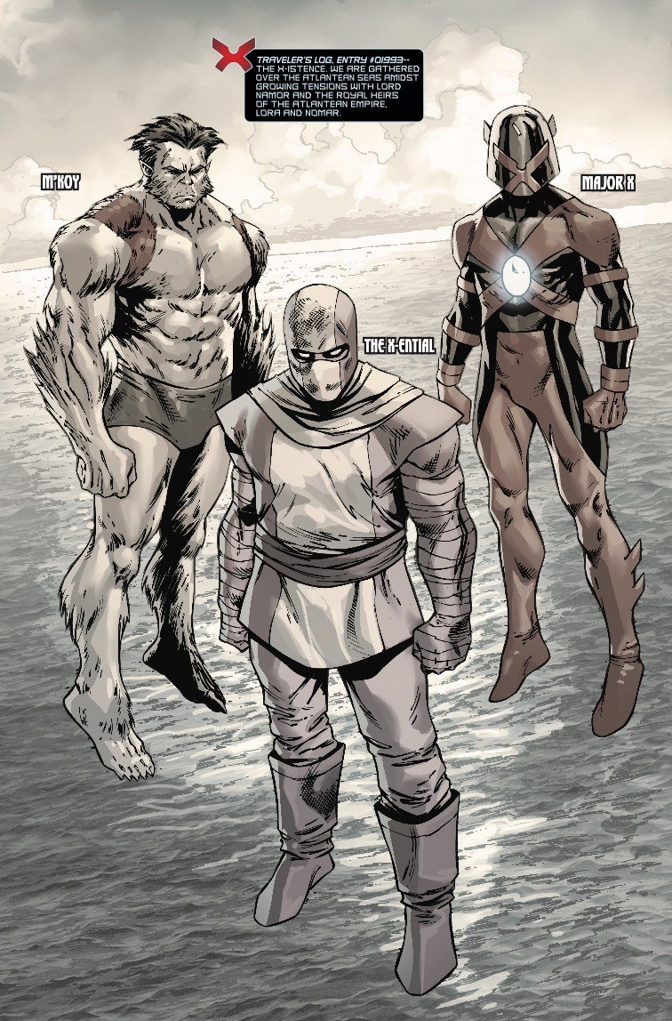 Après un flashback sur « pourquoi les Atlantes en veulent au X-Ential dans X-istence », retour au présent avec les nouveaux et mystérieux ennemis incompréhensibles. Le gamin X-Ential est là, Major-X et M’koy se libèrent ; gros combat sans aucun sens, avec les enfants de Namor (dont Nomar, classe). Boum, boum, boum… finalement, Dreadpool rejoint les Atlantes, le gamin X-Ential emmène Major-X et M’koy à Genosha. Voilà.