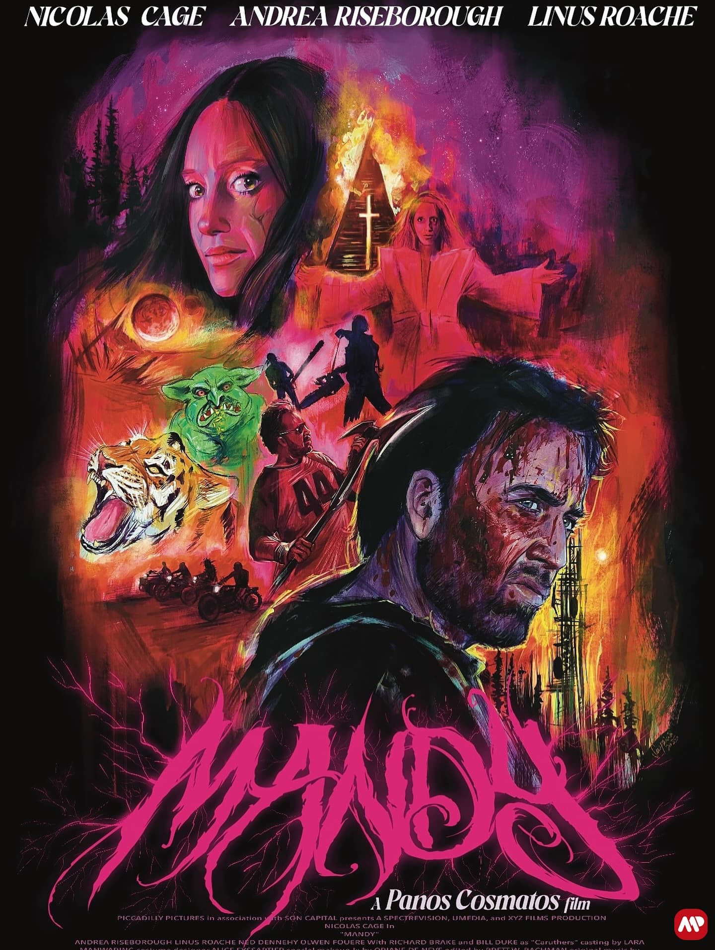 Red et Mandy s’aiment et vivent paisiblement dans un coin reculé des Shadow Mountains. Un petit paradis qui va être détruit par les membres d’une secte, précipitant Red sur la route sanglante de la vengeance. Résumée ainsi, l’histoire de Mandy ressemble à n’importe quelle série B linéaire du même genre. Mais le style particulier de Panos Cosmatos lui confère une identité à part, la transformant en une expérience visuelle et sensorielle qui ne peut que diviser. Pour ma part, j’ai complètement adhéré. Dès le début, le travail sur l’image (il ne faut pas être allergique aux filtres de couleurs), les sons et la musique donnent l’impression de pénétrer dans un autre monde, peut-être même ceux sortis de l’imagination de Mandy (troublante Andrea Riseborough). Le rythme est certes lent mais il aide à l’immersion dans cette autre dimension dans laquelle les figures du mal prennent une allure cauchemardesque. Le Red joué par Nicolas Cage est un peu en retrait dans les deux premiers chapitres avant l’horrible traumatisme qui va le faire basculer dans la folie. Dès lors, le réalisateur plonge encore plus dans le bis (ce qui n’est pas pour me déplaire) avec une quête vengeresse toujours plus étrange, délirante et très gore…sans mettre de côté la tristesse de la perte (le flashback de la première rencontre entre Red et Mandy est très beau). Cage avait parlé du Prisoners of the Ghostland de Sono Sion comme de son film « le plus fou » mais pour moi, c’est bien Mandy qui mérite ce titre…