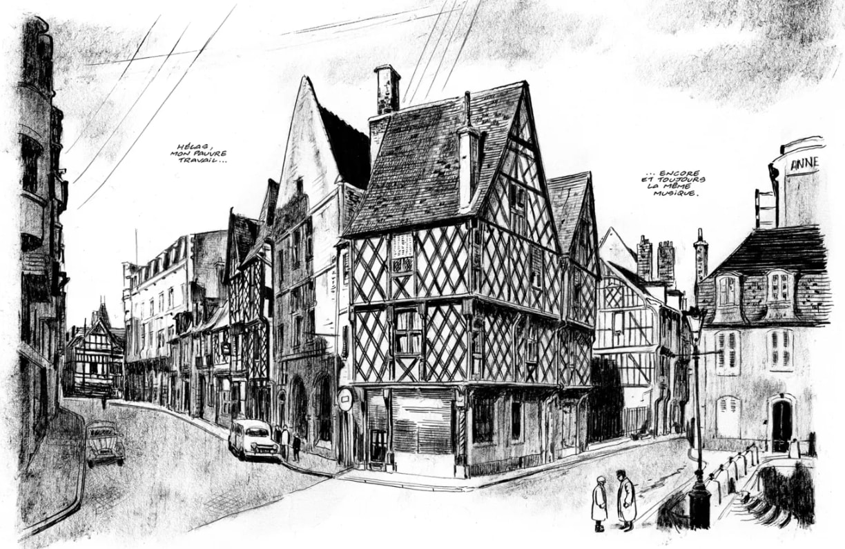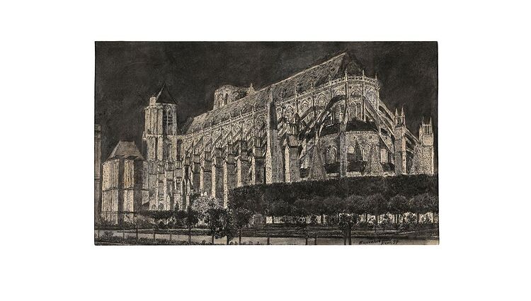 Un homme courbé, que de loin on imagine vieux, pousse une étrange cariole, à travers les ruelles froides et moyenâgeuses de Bourges. Il fait presque jour ; pas encore. Il se cale, sort une feuille de papier immaculée et commence à dessiner méticuleusement le vaste vaisseau de pierre qui se dresse, puissant, dans la lumière fraîche : la cathédrale de Bourges. Pas une arche fine n’est oubliée, il s’applique. La ville s’éveille peu à peu, les gens le croisent sans le voir, peu le saluent, presque personne ne s’approche de cet homme loqueteux : il se gratte follement et pue.