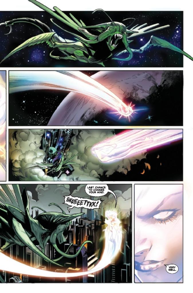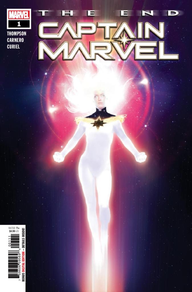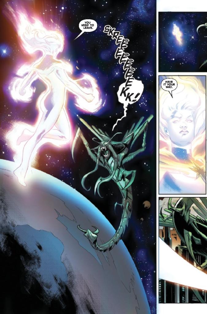 Kelly Thompson s’amuse à reprendre le principe du biper et de l’appel à Captain Marvel perdue dans l’espace… pour acter le destin de Carol, en 2051. A une époque où la Terre a été ravagée depuis des années, et une catastrophe où Carol était absente. Carol s’occupe depuis, rongée par la culpabilité. Mais des survivants sont encore là, l’appellent, et elle découvre plusieurs héritiers et jeunes héros devenus grands. Elle croise même une Jessica Drew vieillissante. Elle aide tout le monde à vaincre un monstre, mais voit que le monde est ravagé par l’absence de Soleil. Carol se sacrifie ainsi, en relançant le soleil, consciente que si elle n’était pas là quand ses amis sont morts… c’est pour être là pour donner une chance à l’Humanité, là.