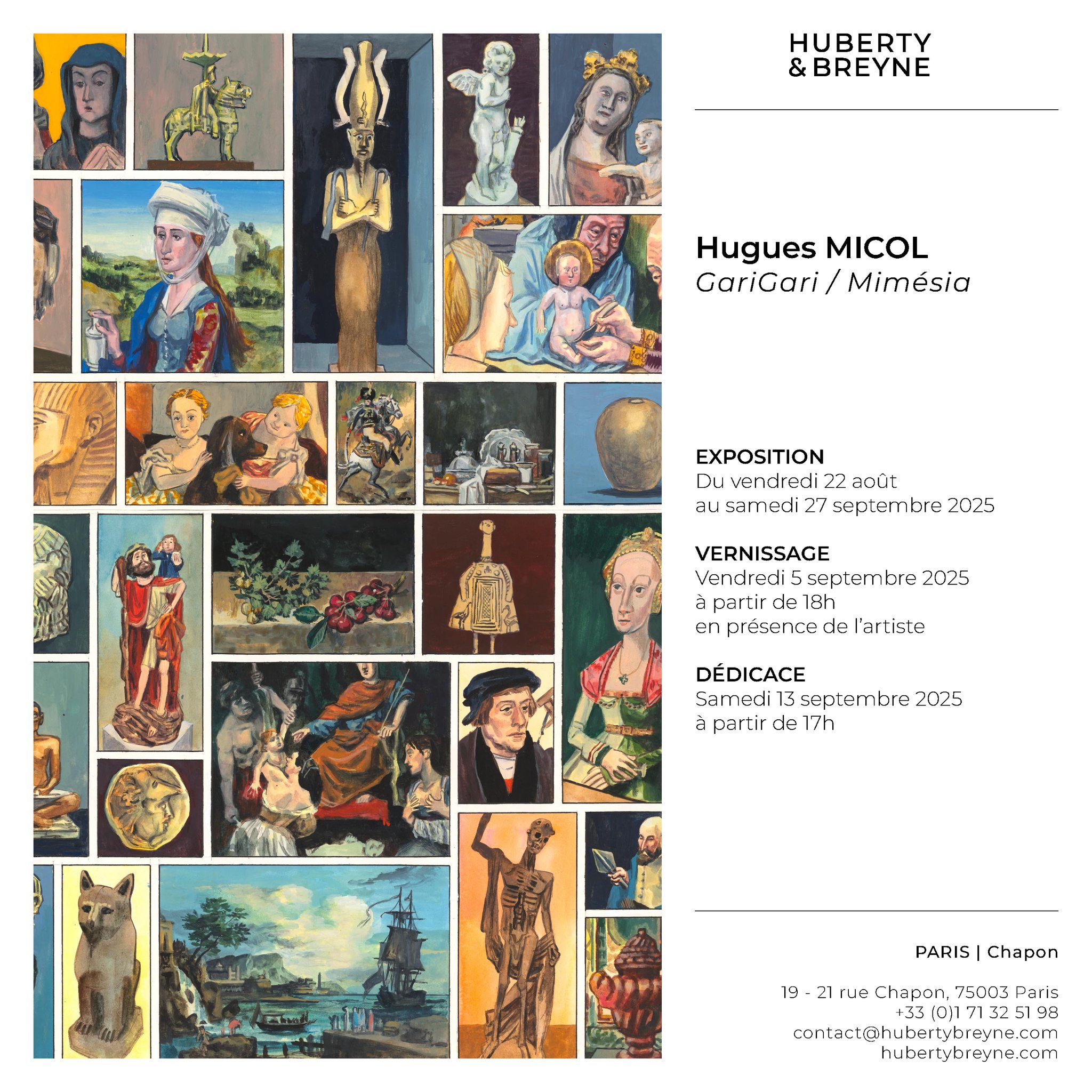 Ce soir, la galerie Huberty & Breyne à Paris, ouvre ses portes à l’univers singulier d’Hugues Micol. Venez découvrir plus de 60 œuvres originales issues de ses deux derniers ouvrages « GariGari » et « Mimésia » (Futuropolis).