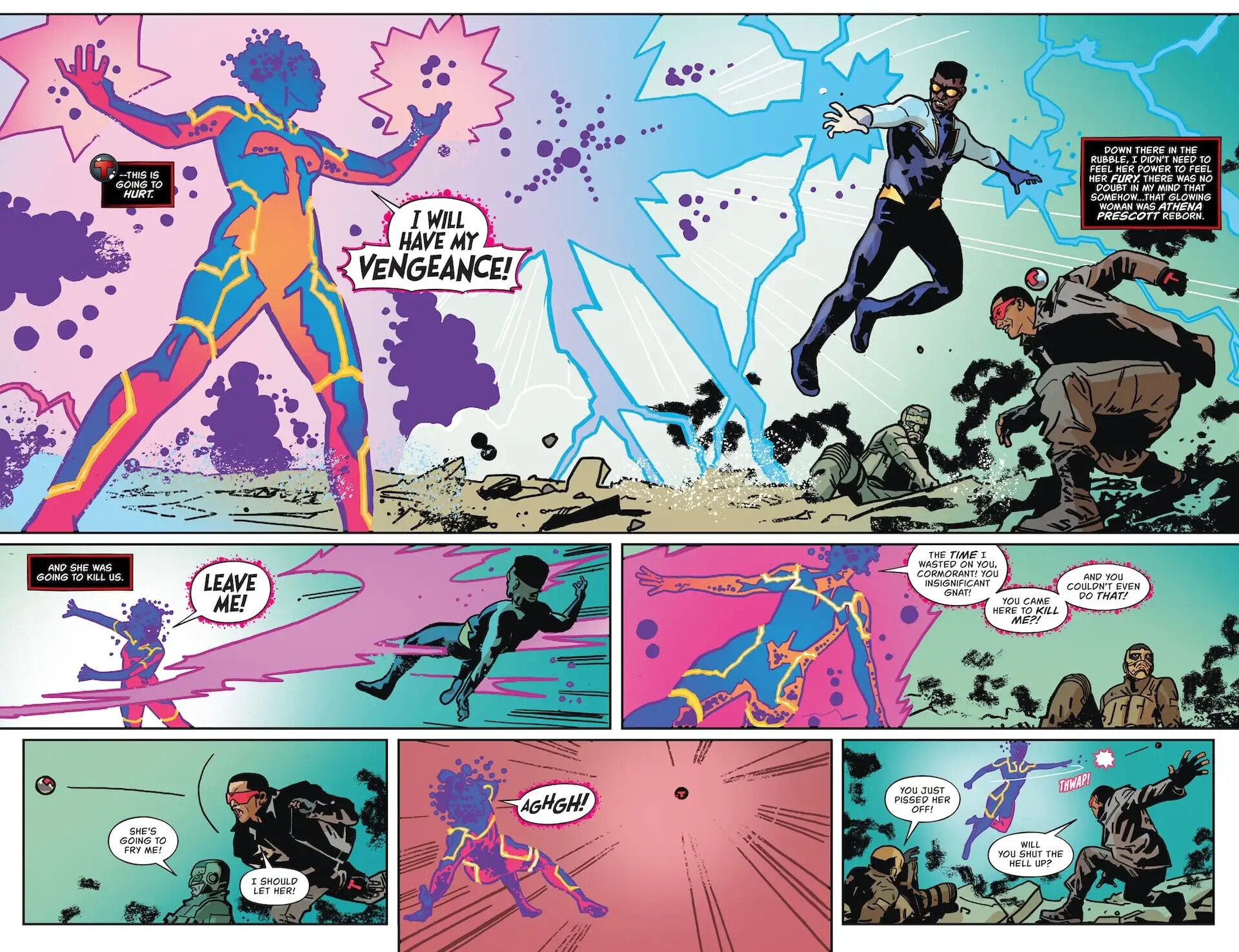Poussif. Al Letson avance poussivement son intrigue au présent, en liant les événements avec le Palace of Eternity vu dans le Flash de Jeremy Adams, et en rappelant le fils de Mr Terrific croisé là-bas ; galère. Alors que dans le passé, Athena Prescott se remet et s’emporte contre ses collaborateurs, alors que Black Lightning vient remotiver Michael. Ils raisonnent sur leurs fonctions, et collaborent pour stopper la centrale menaçante, mais Athena court toujours.