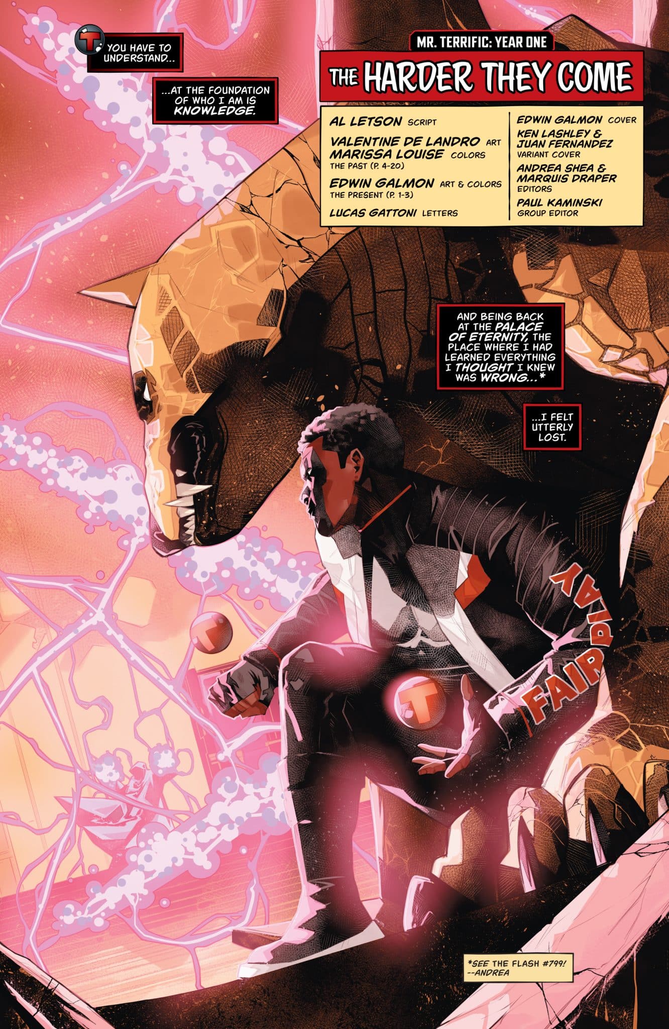 Mr. Terrific: Year One is a new six-issue limited series from writer Al Letson, artist Valentine De Landro (with additional art by Edwin Galmon), colorist Marissa Louise, and letterer Lucas Gattoni. Although some parts of the new series will take place in the present, the majority of the comic appears to turn the clock back to the beginning of Michael Holt’s career as a hero, and particularly his tragic origin story which will be « dramatically revisited and expanded, » according to DC.