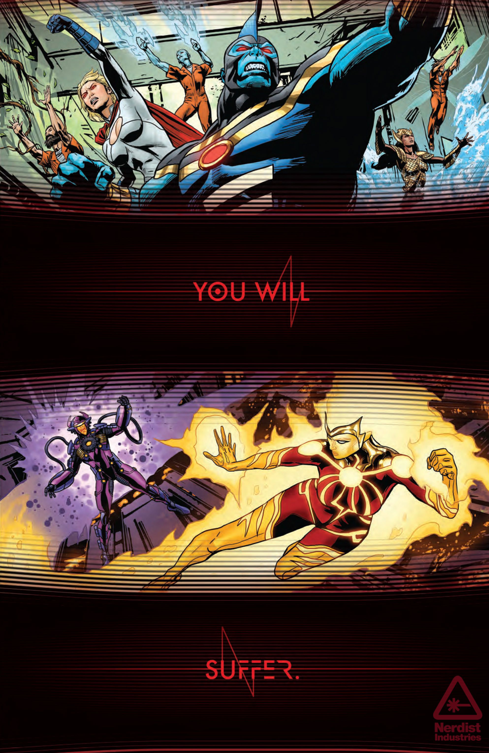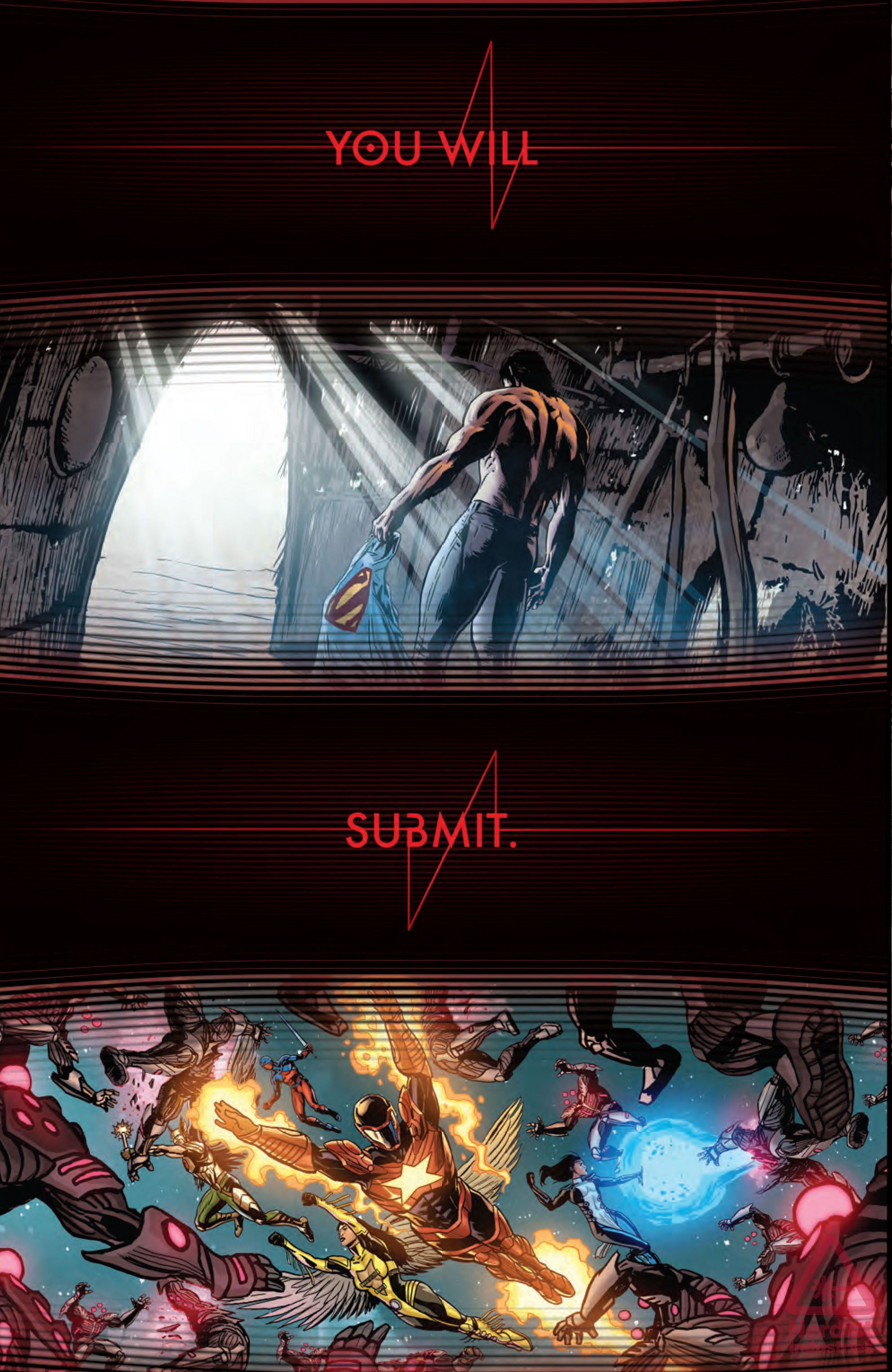 Dr. Polaris is finally aboard the Justice League satellite, and he’ll be sure the Justice League faces the ghosts of every civilian they might’ve saved during the war, if only they didn’t consider themselves too godly to care. Also – up in the sky! It’s definitely not Superman. And it isn’t good![/quote]