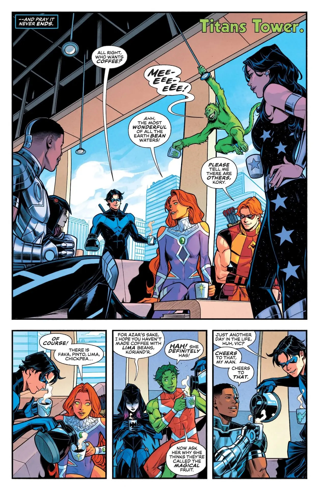 Oula, petite « arnaque » quand même. Tate Brombal reprend la série après John Layman, avec un épisode classique mais un peu trop facile quand même. L’on voit en effet les Titans classiques et récents (Nightwing, Donna, Arsenal, Beast Boy, Raven, Cyborg, Starfire) profiter du temps ensemble mais être attaqués… chaque jour, au même moment, à l’heure du café, par une succession d’ennemis habituels. Un message flou passe par la machine à café pour Dick, l’invitant à ne plus boire de café, mais Grayson lutte difficilement. Il finit par briser la machine, et ses Titans semblent affectés – et les murs s’ouvrent, pour que l’arrivée en sauveurs des « New Titans » (Jon Kent, Yara Flor, Spoiler et Kid Devil).