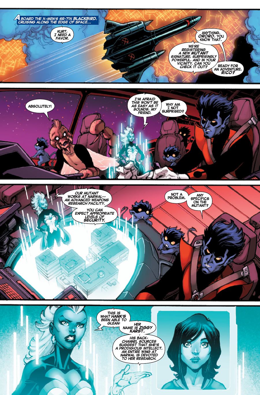 Je viens de relire les quatre premiers, qui fonctionnent très bien. Revenu de l’au-delà (dans les épisodes d’Astonishing X-Men de Jason Aaron), Kurt doit se réadapter au monde des vivants. Il renoue avec ses amis mutants et, bien entendu, avec Amanda Sefton, l’hôtesse de l’air sorcière avec qui il a grandi puis entretenu une relation amoureuse. Et bien entendu, il est attaqué par un nouveau venu, qui se fait appeler Trimega.