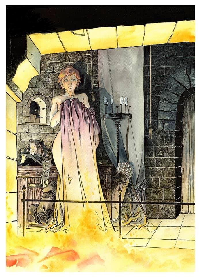 Question dessin, l’ensemble est de qualité, avec des décors soignés et des planches riches qui renvoient à la longue tradition de bande dessinée historique (à la Vécu, quoi…) avec cette fibre épique qui vibre depuis la série de Dorison et Alice. Les personnages sont plus inégaux, parfois magnifiques, parfois bancals. L’encrage et son souci de modeler des ombres évoque parfois Swolf, notamment dans les flash-backs en crayonnés.