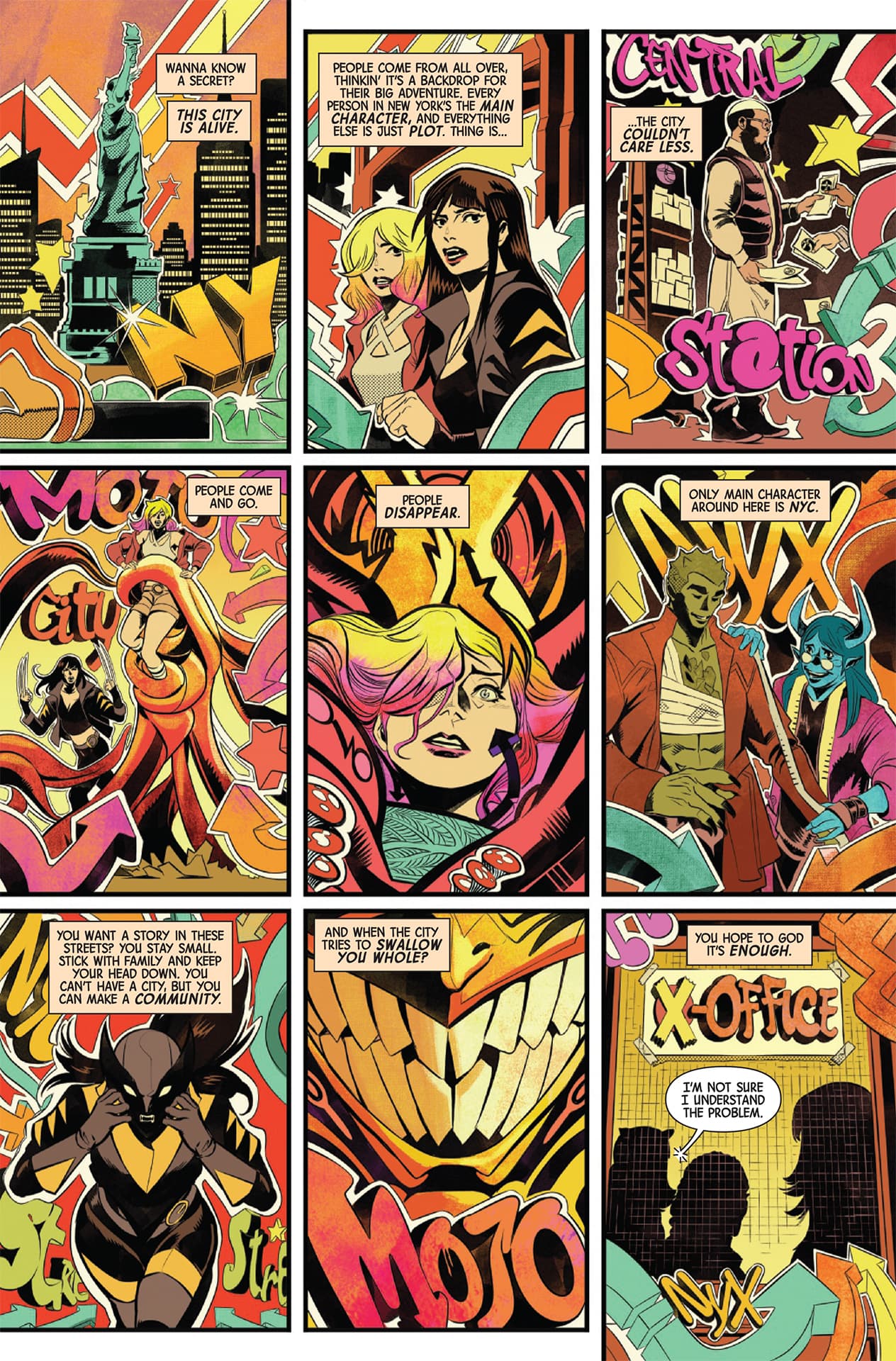 Will the return of their dearly departed mentor bolster the burgeoning community that calls itself NYX or tear everything they’ve built apart? What does Xavier want from the city? What is he willing to do to get what he wants? And — perhaps most alarmingly of all — who else is waiting in the wings to strike?!