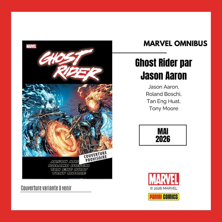Enfin, un Omnibus Marvel quasi intégralement inédit qui vient combler un manque historique dans notre catalogue : l’intégralité du run de JASON AARON sur GHOST RIDER ! Plus de 500 pages de bonheur et de possessions démoniaques illustrées par Roland Boschi, Tan Eng Huat et Tony Moore !