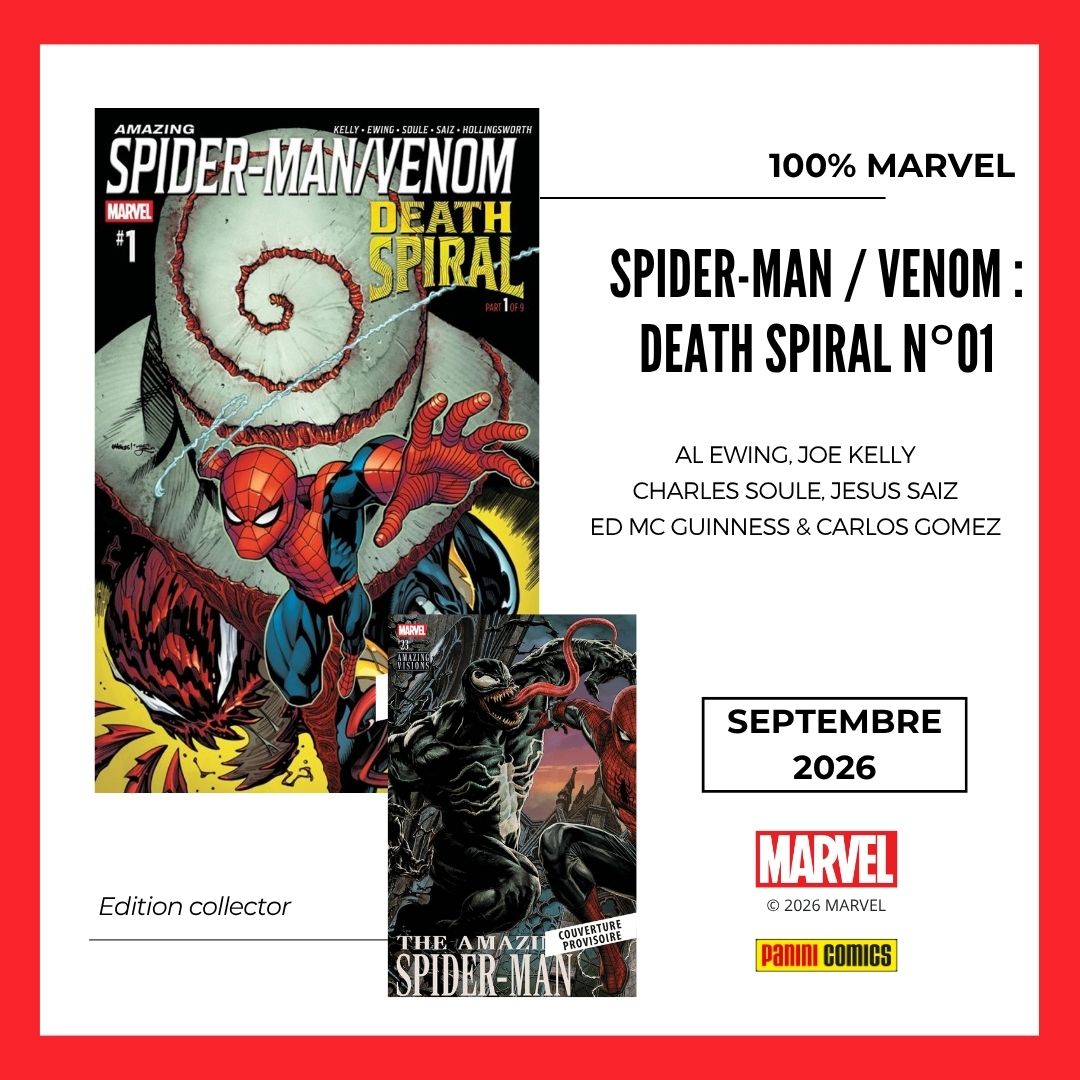 DEATH SPIRAL en septembre ! Une saga en deux tomes (septembre/octobre) avec comme à l’accoutumée le choix entre softcovers et hardcovers pour découvrir les destins liés de SPIDER-MAN, VENOM et CARNAGE pris dans le tourbillon sanglant de TOURMENT ! Un récit imaginé par Joe Kelly, Al Ewing & Charles Soule !