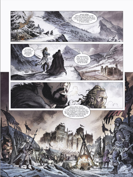 Peu de choses se passent finalement, et si les auteurs veulent embrasser toute la Geste arthurienne, on peut être partis pour bien trente tomes, là. On voit en effet ici l’origine rapide de Calibur l’épée, l’état des lieux de l’île d’Alba après les temps glorieux vus par Merlin (qui veut les ramener) et le passage des Romains (« ceux de l’aigle »), avec sept rois qui se partagent les terres et un Haut-Roi des Basses-Terres, un Pendraig, héritier du monarque qui a repoussé le dieu Crom jadis. Arthur est le fils bâtard du Pendraig actuel, qui renie son fils mauvais Mordred et l’abandonne esclave aux Pictes. Arthur est un mercenaire, qui tente de s’acheter une place en aidant un roi local à repousser un autre, enragé que la fille Elwenn du premier ait abandonné le mariage prévu (car elle préfère Arthur). Finalement, Merlin manigance, Arthur suit avec flegme, ça bataille un peu, le Pendraig subit quelque chose, et les cartes vont être redistribuées, même s’il faut trouver « quelqu’un » pour marier vite Arthur et Elwenn, et potentiellement l’évêque Barnard, dont la religion du dieu blanc s’institue lentement sur l’île. Tandis que Nimue est « appelée » par Calibur, perdue depuis des siècles.