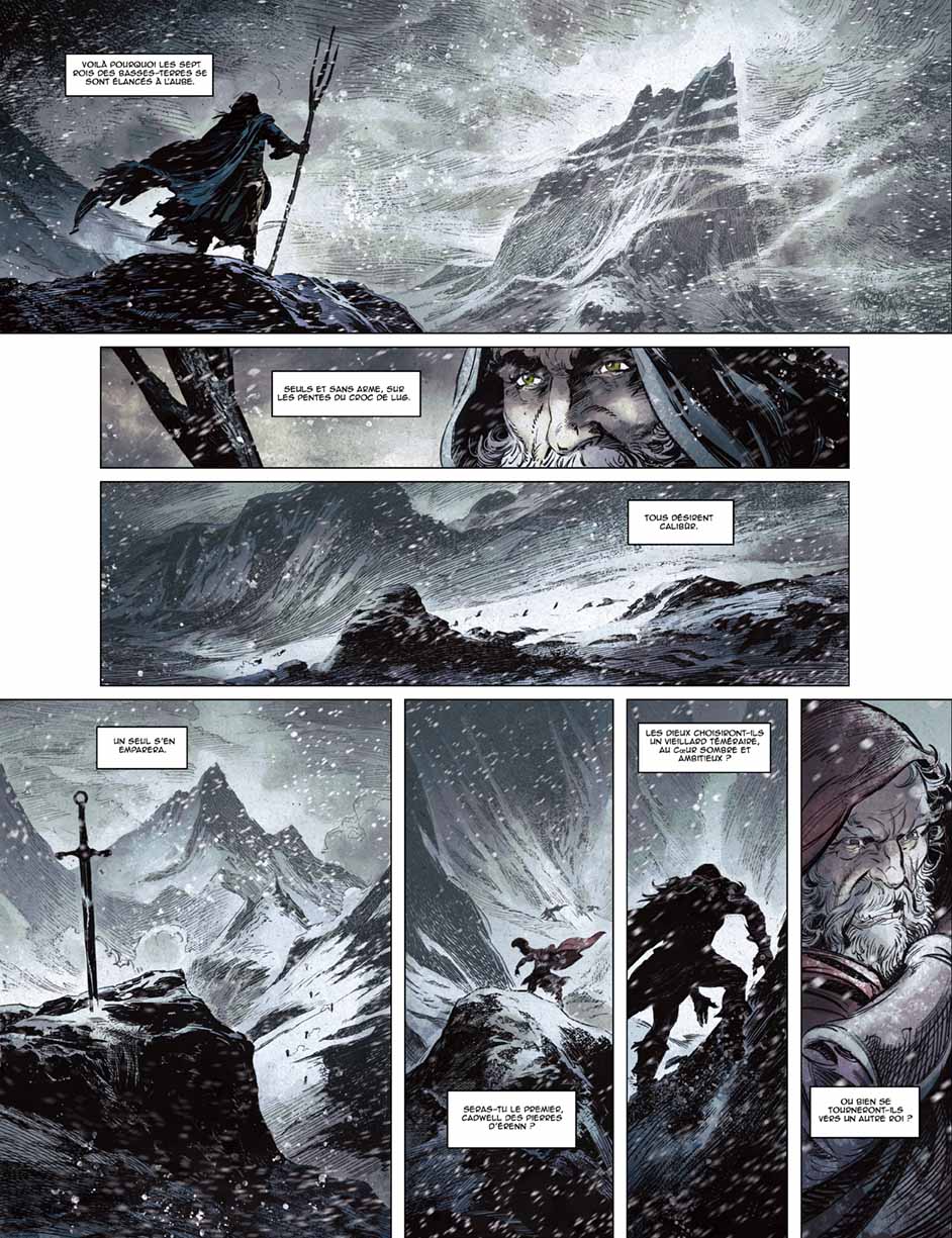 Jérôme Le Gris revisite librement le mythe arthurien en l’inscrivant dans le contexte historique qui aurait vu émerger cette figure légendaire. Le dessin généreux et flamboyant de Paolo Martinello nous propose un univers sauvage, empreint de mythologie celte, tout en s’appuyant sur le story-board hollywoodien de Benoît Dellac.