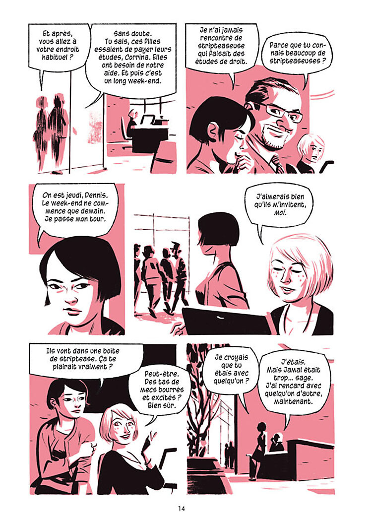 Ce qui est intéressant, c’est qu’au final, même si ça en parle, ce n’est me semble-t-il un récit sur la solitude urbaine ou le drame sempiternel de l’incommunicabilité. Mais plutôt, c’est une chronique d’un monde médiatique où seul le message compte, ni le locuteur ni le destinataire ni le sujet. Il me semble que la séquence éclairant l’ensemble, c’est celle où Corrina s’endort devant les infos télévisées et où il est clairement expliqué que le sensationnel prime sur le véridique. Située plus ou moins vers le milieu du récit (avant la rencontre qui fait bascule), cette scène donne le ton : que ce soit la pub, les slogans, les infos, la photo, les réseaux sociaux, tout l’album met en évidence la primauté du message sur la communication réelle. Le fameux distinguo entre parler aux gens et parler avec les gens, qu’on retrouve dans les dialogues.