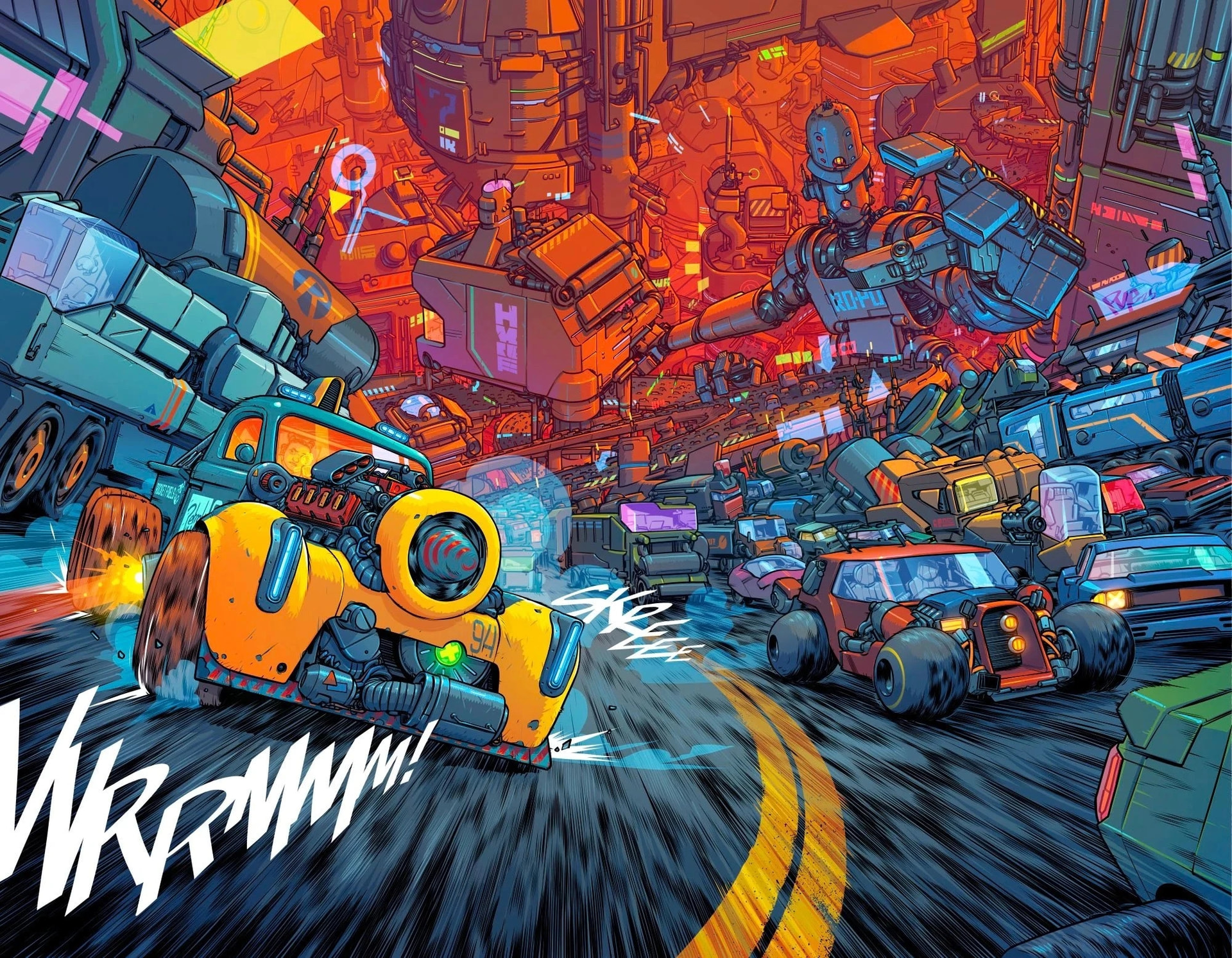 ESCAPE THE SMOGZONE WITH THE FAST & THE ROBO-FURIOUS! There’s no escape from THE O and his robo-police! Petrol Head’s beloved ride faces destruction, Lupa must make the toughest choice imaginable, and Petrol Head turns to his worst enemy for help. Ugh! And watch out, SuperCarStar™ is entering the race! « PETROL HEAD is incredible. ROB WILLIAMS has crafted a story full of whip-smart sci-fi and high-octane action and PYE PARR’s art is revelatory. And it’s a demolition derby for the future of mankind. Don’t miss it! »—SCOTT SNYDER (Batman, WYTCHES)FAST & THE ROBO-FURIOUS!There’s no escape from THE O and his robo-police! Petrol Head’s beloved ride faces destruction, Lupa must make the toughest choice imaginable, and Petrol Head turns to his worst enemy for help. Ugh! And watch out, SuperCarStar™ is entering the race!RS A & B PYE PARR « PETROL HEAD is incredible. ROB WILLIAMS has crafted a story full of whip-smart sci-fi and high-octane action and PYE PARR’s art is revelatory. And it’s a demolition derby for the future of mankind. Don’t miss it! » —SCOTT SNYDER (Batman, WYTCHES)