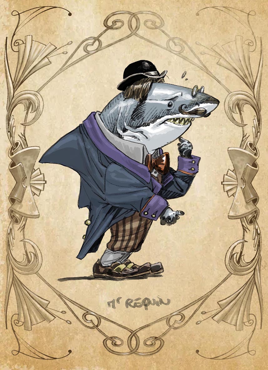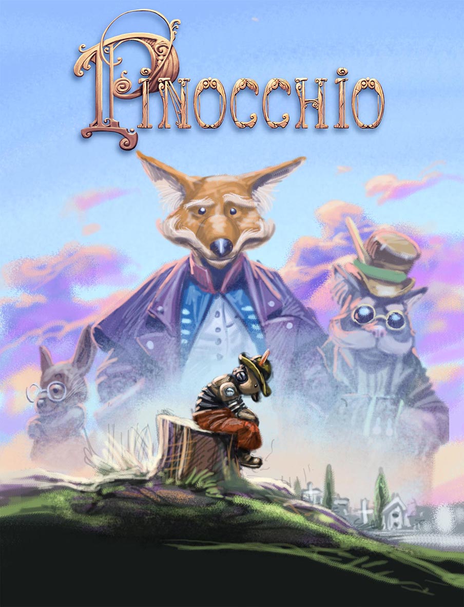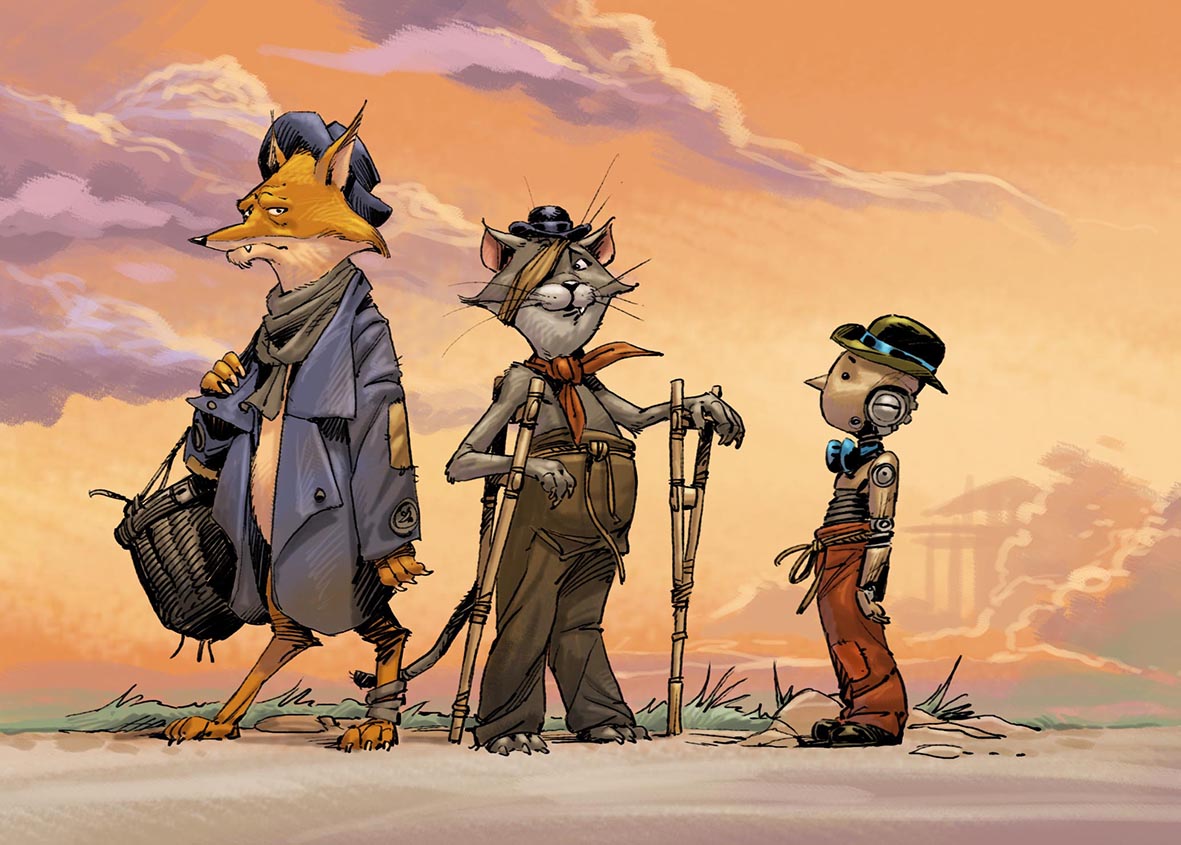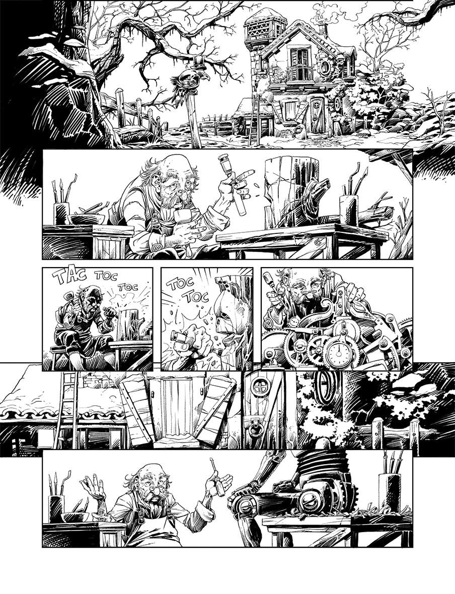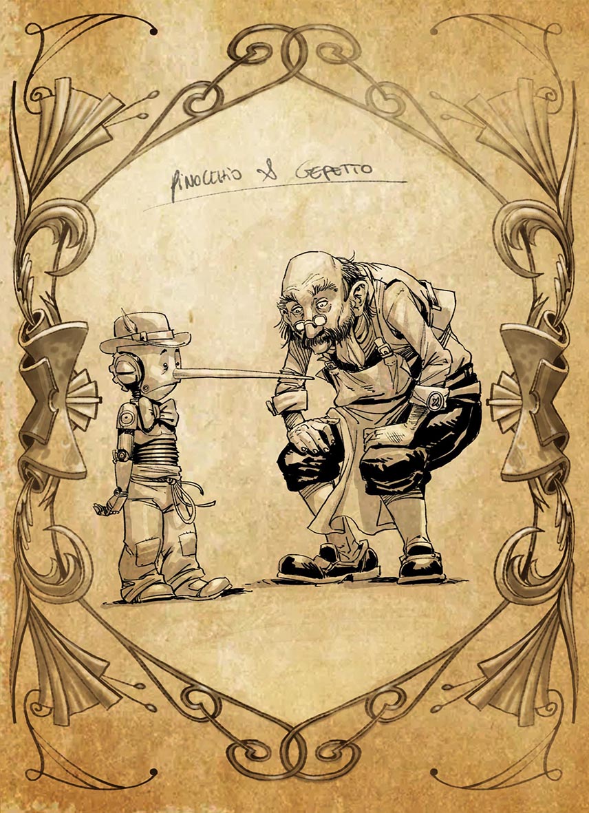 Jean-Luc créé l’univers, personnages et décors et les ambiances couleurs. Je participe à ce travail en second plan, je créé ce qu’il n’a pas défini. Je créé Pinocchio qui est un de mes pantins mécaniques. Béatrice va inventer la fée aux cheveux bleus, personnage important de l’histoire originale. Elle va illustrer les pages titres des chapitres et créer l’introduction.