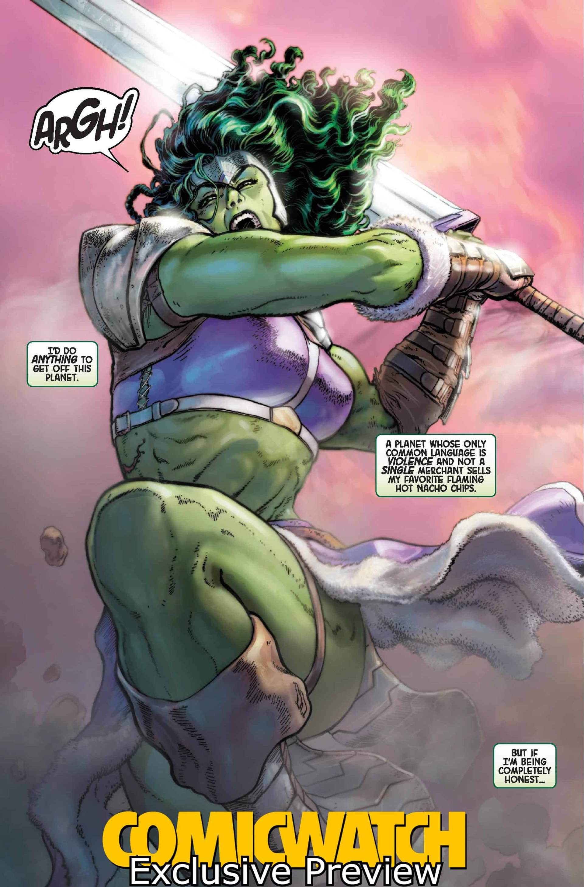 She-Hulk is back, and she’s… stuck on Sakaar?? Jennifer Walters made a promise to her cousin, Hulk, to watch over the planet Sakaar and its people for a few days. But it’s been longer than a few days, and now She-Hulk is in charge of keeping the peace on a planet at war! But Jennifer is a VERY different Hulk than the one that once smashed Sakaar into submission…is she up for the task?“I’m so excited,” Phillips said. “Working with Aaron is so exciting, it’s fantastic. [For Planet She-Hulk], think big game of thrones. Think things not always related to She-Hulk. She’s ripped into a world that she’s not used to, and she has to bring her own sensibilities to it when she’s now facing witches, rebels, and cannibals… it’s going to be great. We wanted to go big. She’s got a giant sword, PLEASE let us use it.”