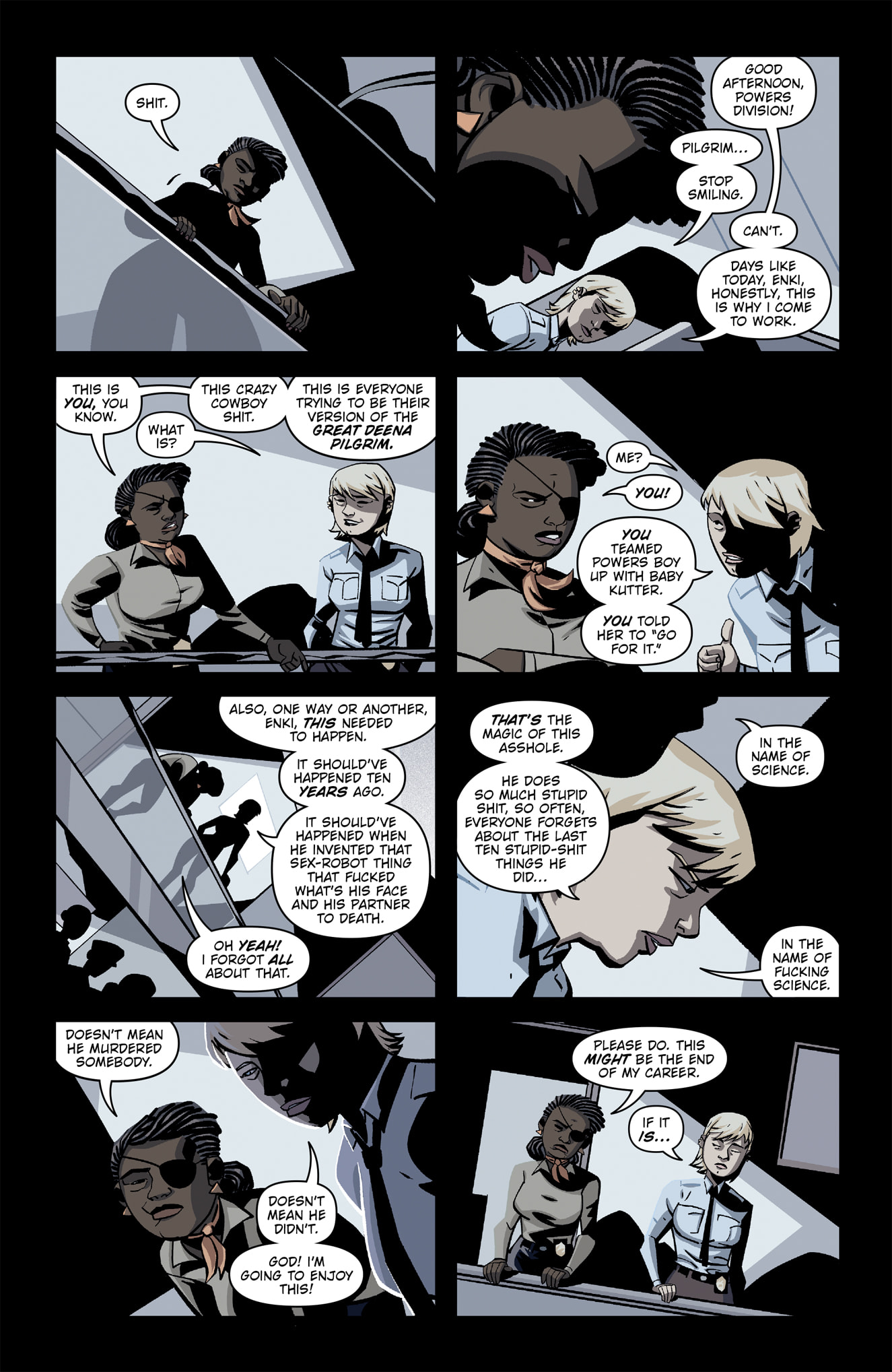 This new tale is a fun, dangerous, adult look at a world of heroes through the eyes of special homicide officer Detective Kutter and her brand-new partner, and the first power to ever make the powers division, Moebius Moon. Under the watchful eyes of legendary Captains Deena Pilgrim and Enki Sunrise, the new detectives run through a minefield of all-new dangers. A new unsolvable powers murder has Kutter and Moon questioning EVERYTHING about the world and their place in it.