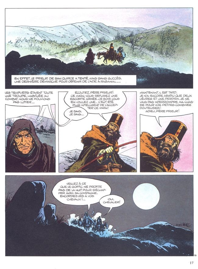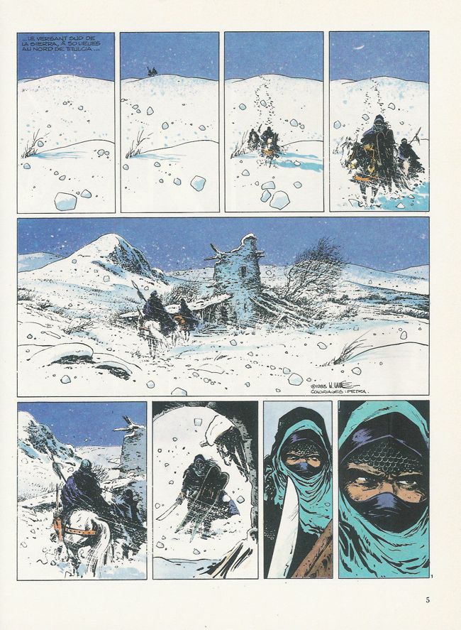 Cela dit, l’album n’est pas exempt de défauts, même s’il se lit de manière plus fluide que les précédents. Après le résumé de l’agression du village et la présentation du petit commando, les cinq du titre, dont Ramiro prend la tête (laissant espérer une sorte de récits à la Sept Mercenaires ou Douze Salopards), l’album se contente de gagner du temps en racontant comment l’équipe déjoue un détroussage puis affronte la neige en pleine montagne. Si les débuts avaient le mérite de replacer clairement Ramiro dans le contexte de la Reconquista (mais les notes de bas de page, envahissantes, alourdissent la narration), la suite, la longue partie montagnarde, pour spectaculaire qu’elle soit, semble marquer un peu le pas, remplir les pages de l’album en attendant le cliffhanger qui annonce la suite.