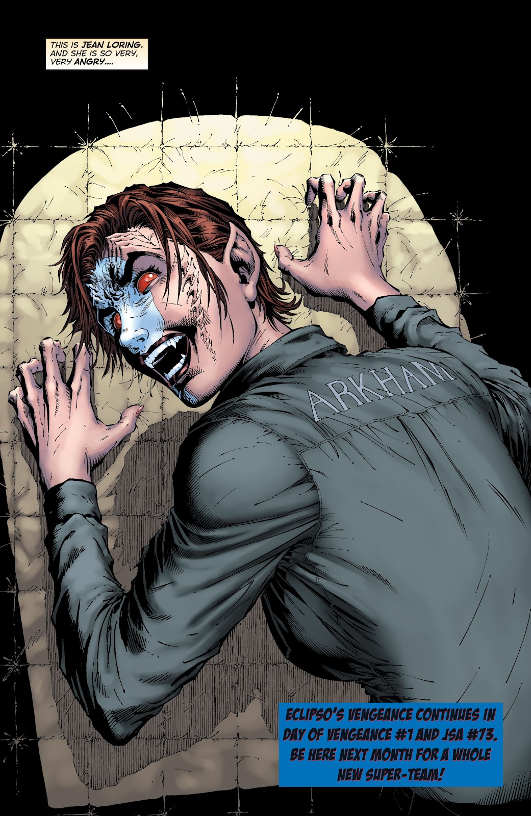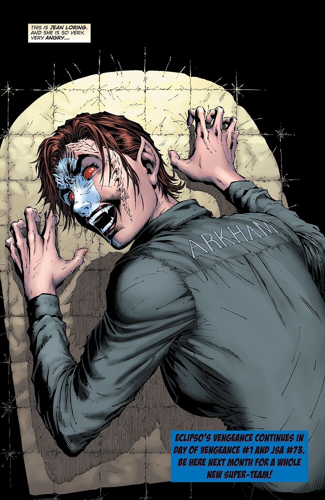 La révélation forte survient à la dernière page de l’épisode, quand on découvre que Jean Loring, l’épouse d’Atom emprisonnée à l’asile Arkham après les tragiques événements d’Identity Crisis, est désormais possédée par Eclipso.