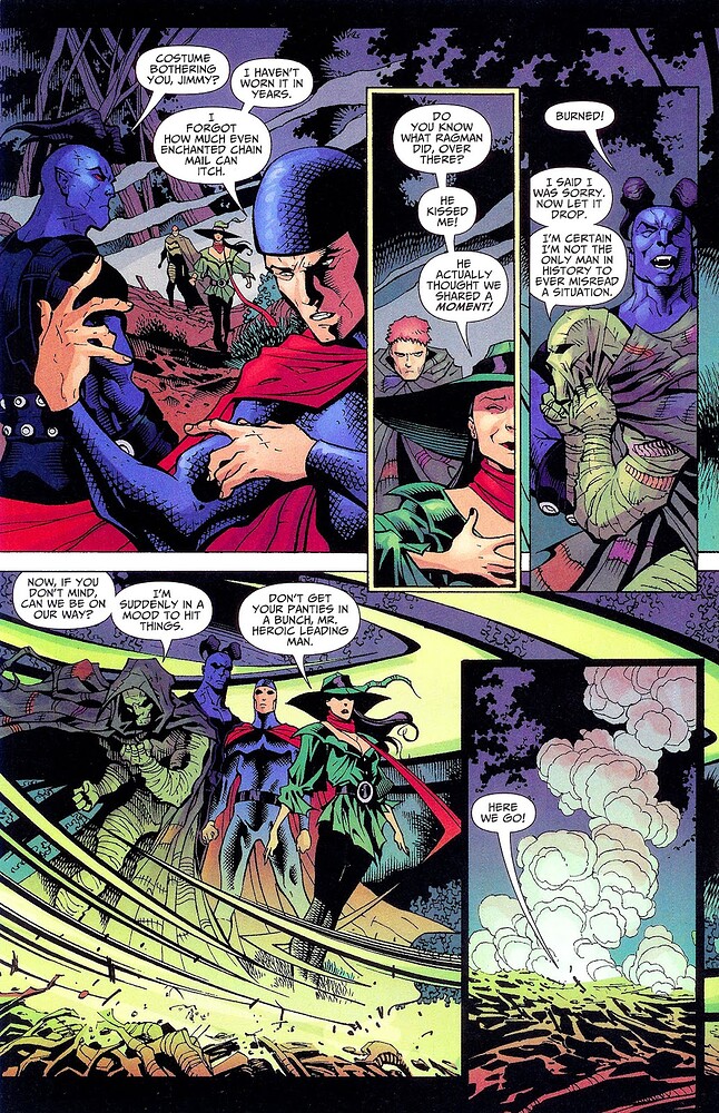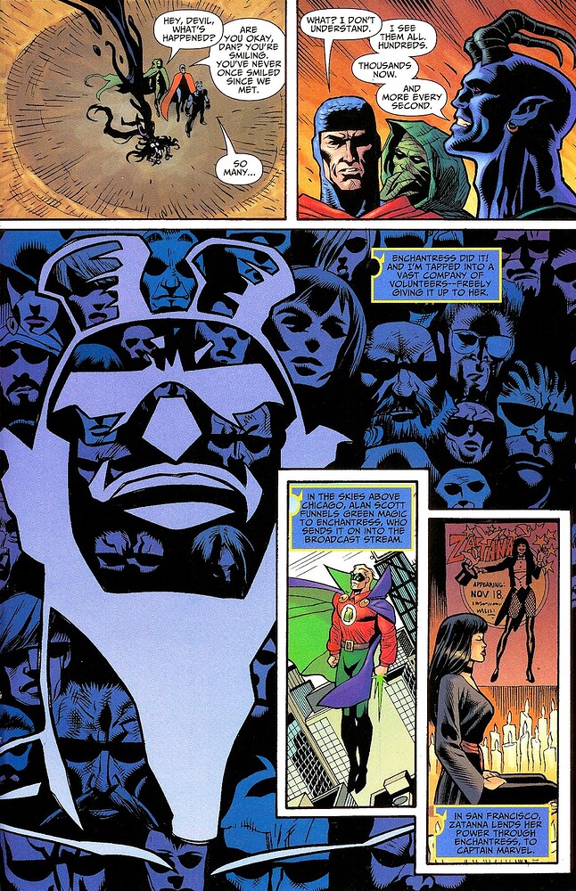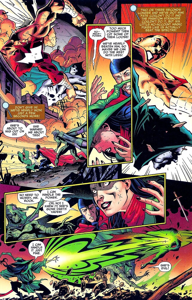 Le scénariste s’intéresse notamment à Enchanteress et Ragman, faisant du second un héros frustré et troublé, et de la première une sorcière craignant de tomber du côté obscur. Cette caractérisation n’est pas là pour faire joli, puisqu’il décrit le plan de l’enchanteresse, qui tente de canaliser toutes les énergies magiques afin de soutenir Captain Marvel face au Spectre. Bien entendu, la jeune femme perd le contrôle, ce qui rajoute des péripéties.