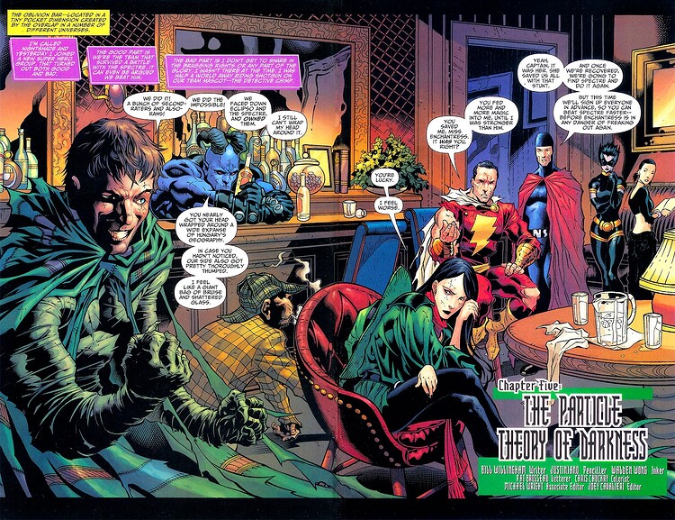De même, c’est l’occasion de consolider des idées posées jadis et jamais réellement exploitées, à l’exemple de l’Oblivion Bar, le pub où se réunissent les héros magiques autour de Jim Rook, le Nightmaster, un personnage secondaire inventé dans Showcase en 1969. Avec Day of Vengeance puis Shadowpact, l’endroit deviendra l’un des points incontournables de l’univers DC. Les initiatives de Didio n’auront pas que des effets négatifs.