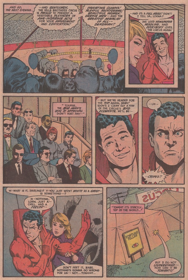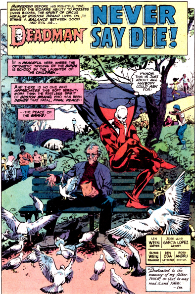 Quand Adams s’en va, Deadman se retrouve errant de série en série, apparaissant dans les aventures des autres. Une sorte de conclusion paraît dans un épisode de Batman, et ensuite le héros fait figure d’observateur ou de deus ex machina dans différentes séries, parfois chez le Phantom Stranger, parfois chez les Challengers of the Unknown. Ça, c’est le contenu des tomes 3 et 4 de cette intégrale. Le quatrième, au demeurant, contient quelques histoires courtes dessinées par José Luis Garcia-Lopez, qui livre peut-être les plus belles pages consacrées au personnage (j’adore Adams, mais le réalisme élégant de Garcia-Lopez l’emporte dans mon cœur).