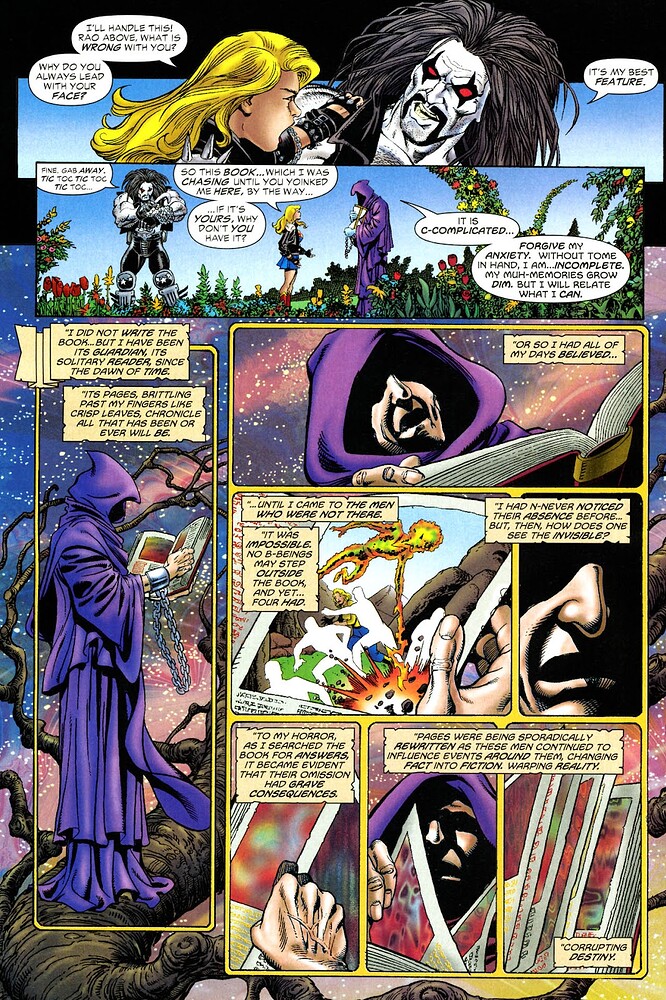 Fusionné avec Tharok, Batman est précipité dans le lointain futur où il rencontre la Légion des Super-Héros (qui ne fait pas le poids). Kara et Lobo croisent Destiny qui explique qu’il s’est séparé de son livre dans le but de le confier à quatre êtres qui, inexplicablement, échappent au récit qu’il contient.