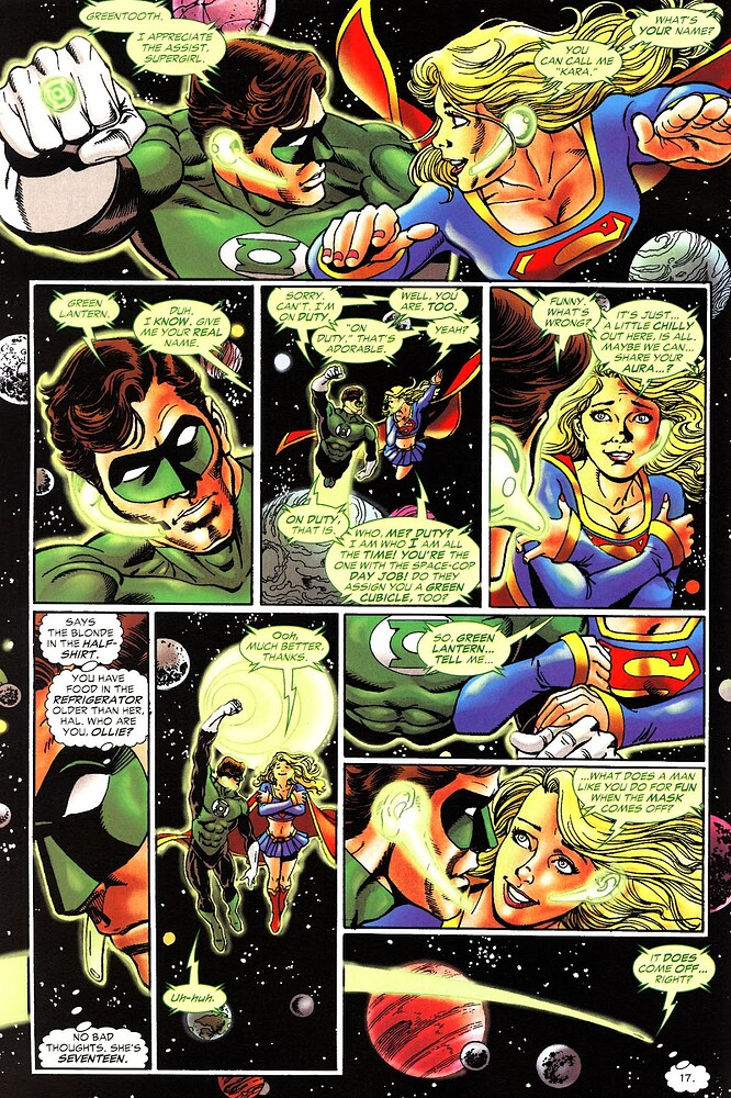 Dans l’épisode suivant, Hal fait équipe avec Supergirl tandis que Batman s’allie à Jaime Reyes, le nouveau Blue Beetle. Waid ne manque pas d’idées pour caractériser ses personnages : dans le premier chapitre, il présentait un Bruce Wayne très jamesbondien, mais en même temps très rafraîchissant. Dans celui-ci, il montre Jordan focalisant sur l’âge de sa jeune équipière, ce qui permet de rappeler sur un ton humoristique le séducteur toujours sensible aux jolies blondes, et de définir Kara en creux.