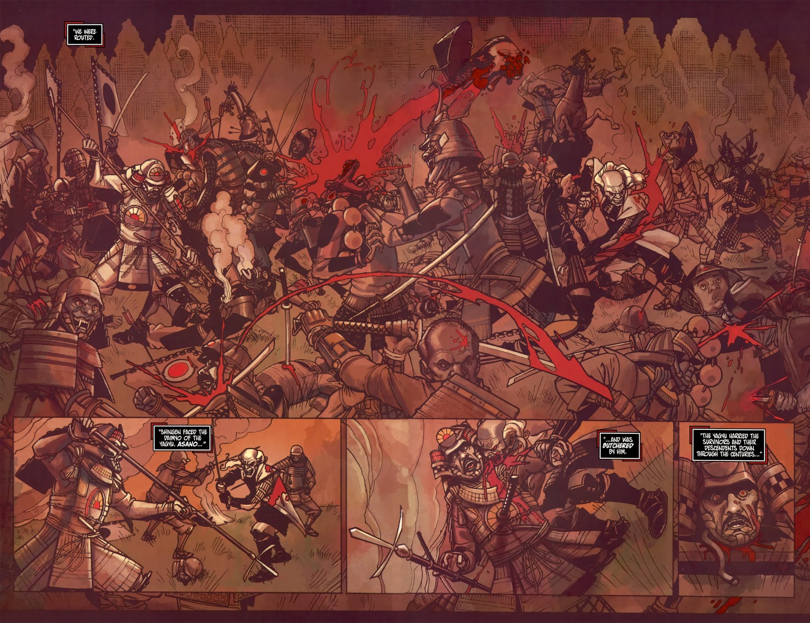 C’est ainsi que commence Shinku, une série écrite par le prolifique et souvent très lisible Ron Marz, et illustrée par le mésestimé Lee Moder. Le tandem d’auteurs ne tarde pas à donner des informations : Shinku lutte contre des gangs de vampires régnant sur le pays, héritière en cela d’une longue tradition remontant à plusieurs siècles. Elle est aidée dans sa mission par Oshima, un sumo que la justicière a sauvé des crocs de ces suceurs de sang.