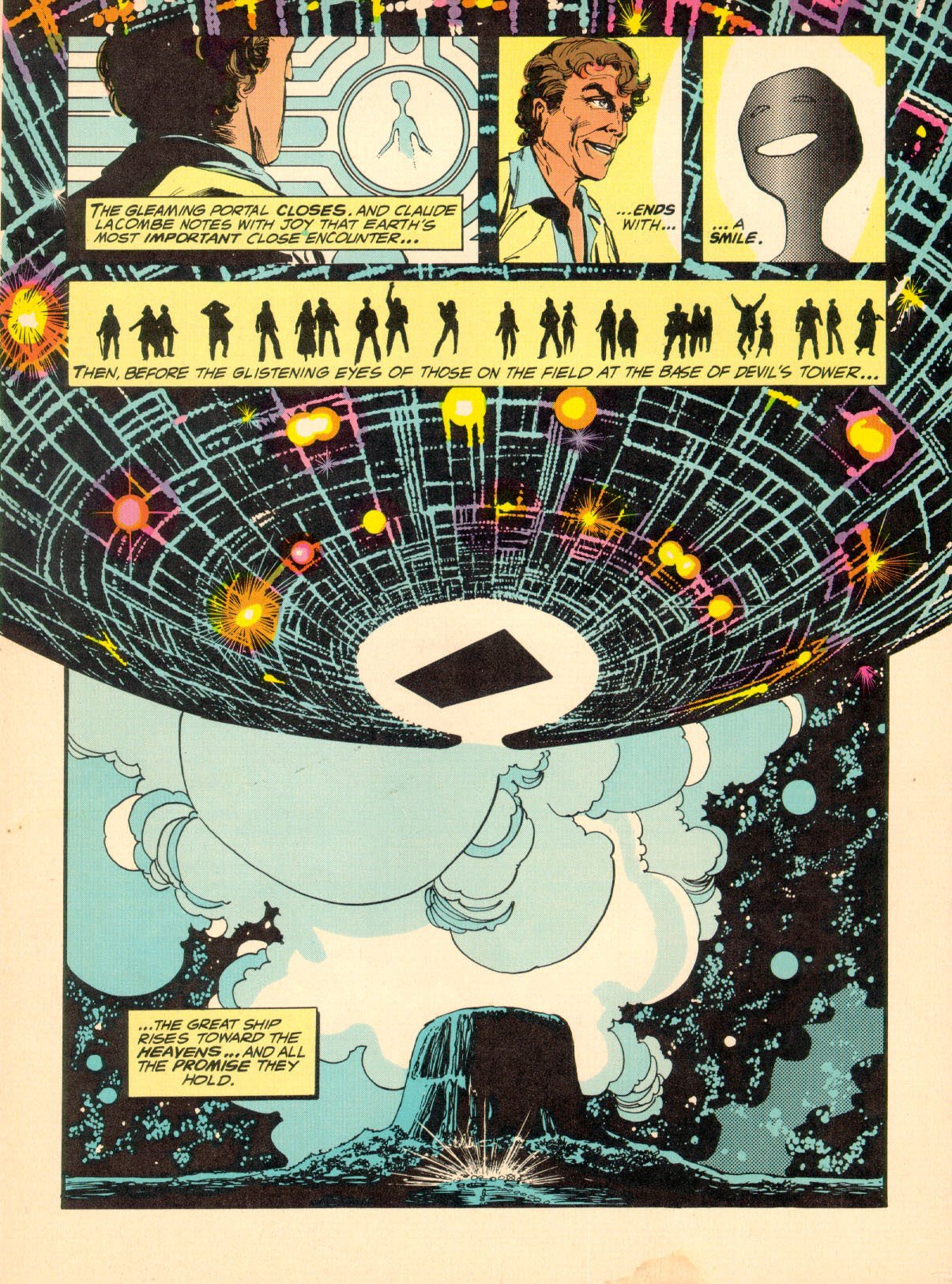 Au final, ce sera la musique imaginée par John Williams qui facilitera la communication entre les extraterrestres et l’humanité. Juste cinq notes, l’un des exemples les plus célèbres de musique diégétique. Après avoir surmonté de nombreux obstacles (imposante opération de désinformation de la part des autorités), Roy et Jillian vont découvrir le lieu implanté dans leur subconscient au terme d’une quête pleine de suspense. Grâce aux superbes effets spéciaux de Douglas Trumbull et de ses équipes, l’émerveillement est au centre du dernier acte (même s’il y a un contraste entre l’apparition du premier alien filiforme et les petites formes baignées de lumière), point de départ de la nouvelle vie d’un Roy Leary qui ne va plus faire que regarder les cieux (et dont la famille n’occupe plus du tout les pensées).
