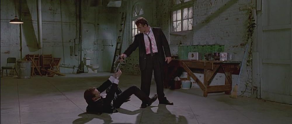 Rien qu’avec ce prologue, on devine que Mr White (Harvey Keitel) a une carrure de leader, que Mr Orange (Tim Roth) observe les autres et les imite par moments, que Mr Blonde (le regretté Michael Madsen) cultive un côté dangereux derrière sa nonchalance, que Mr Pink (Steve Buscemi) est une grande gueule qu’il peut fermer quand il n’est pas en position de force. Mr Brown (Tarantino himself) est le plus volubile avant de s’effacer du reste du film tout comme Mr Blue (Edward Bunker) qui doit être l’acteur de la bande qui a le moins de répliques.